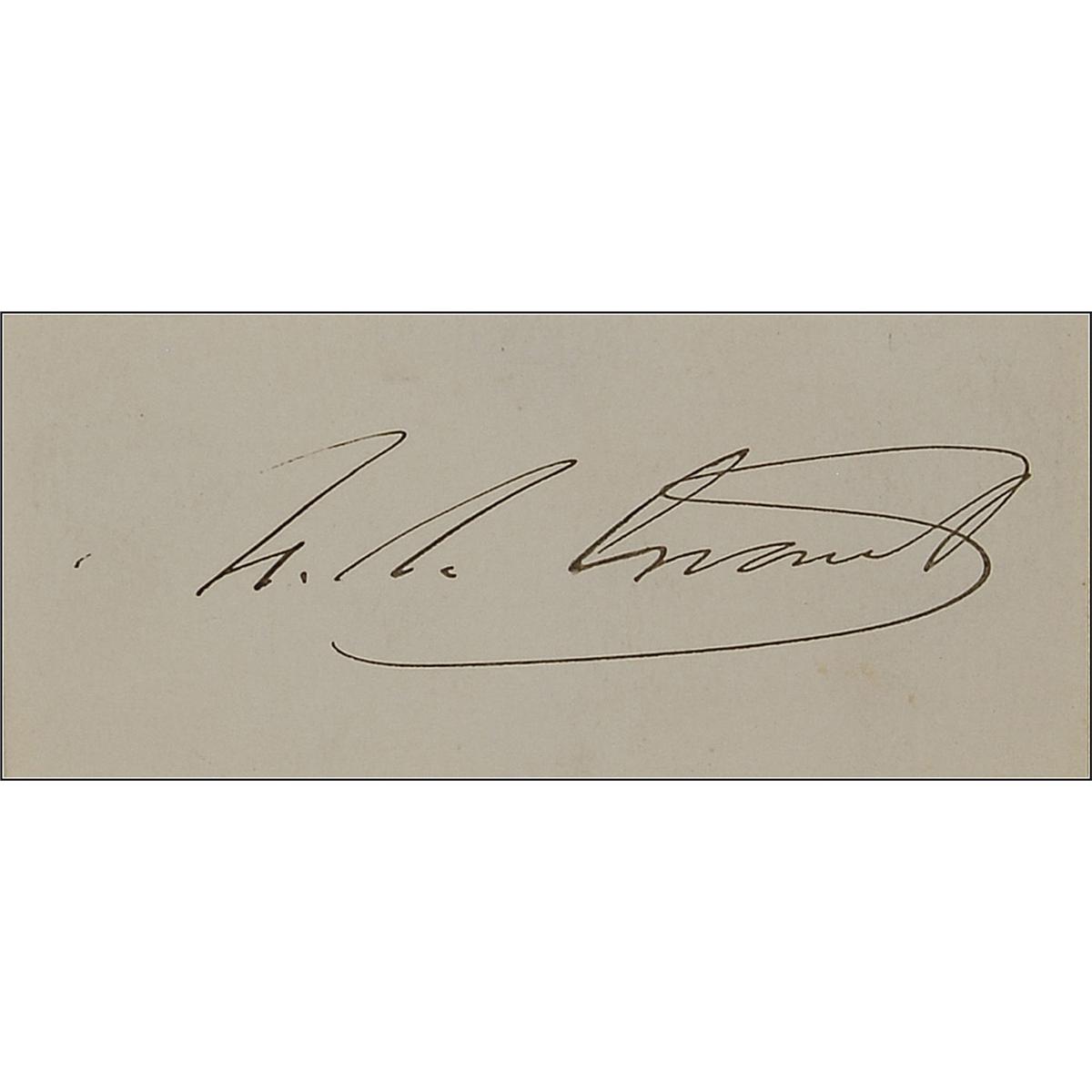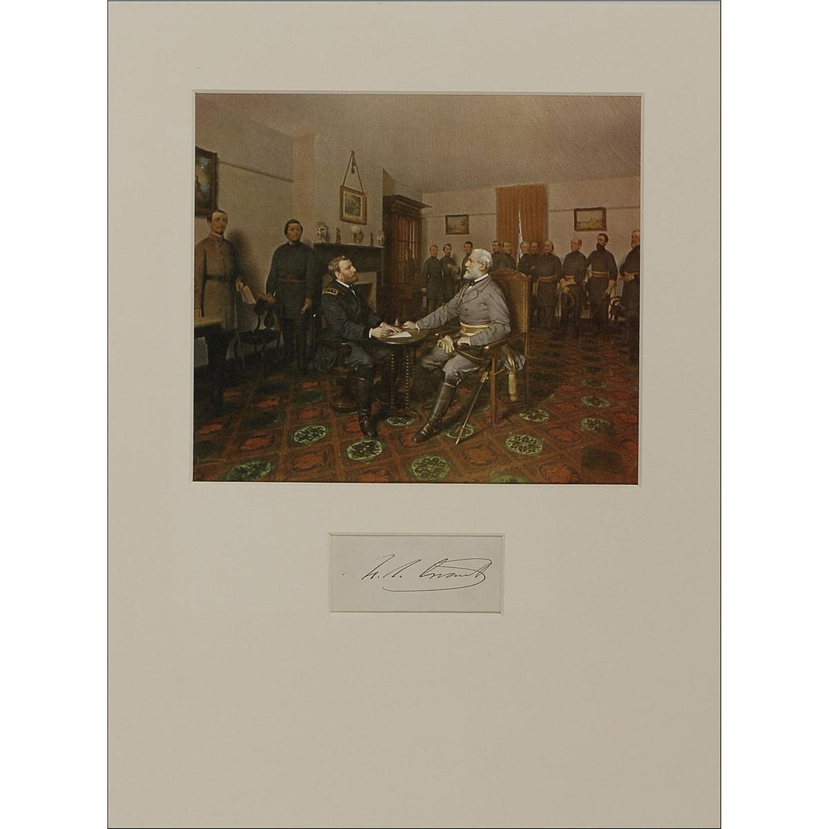 Ink signature, “U. S. Grant,” on an off-white card. Matted with a color portrait of Grant with Robert E. Lee at Appomattox, to an overall size of 12 x 16. In fine condition, with a bit of scattered light soiling.