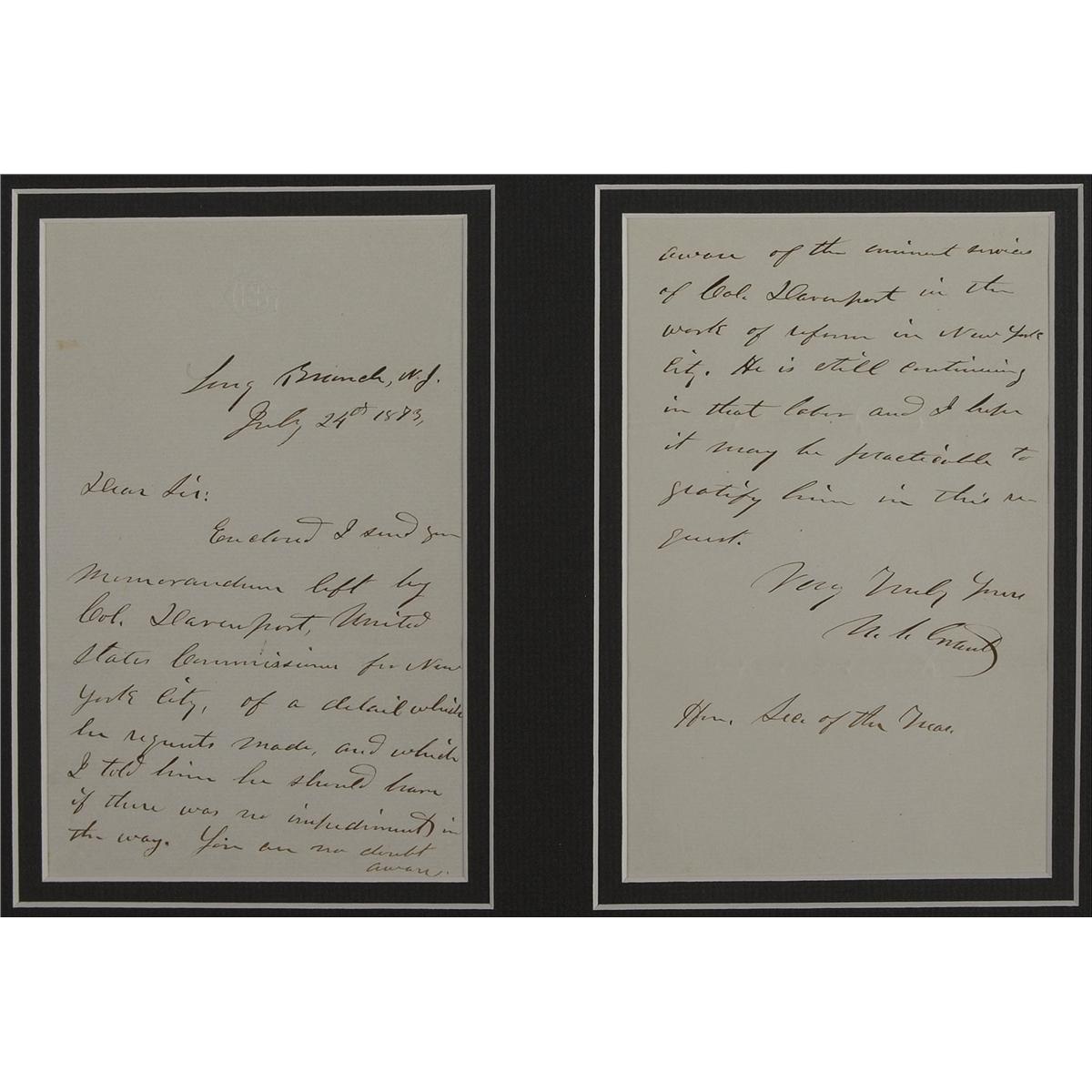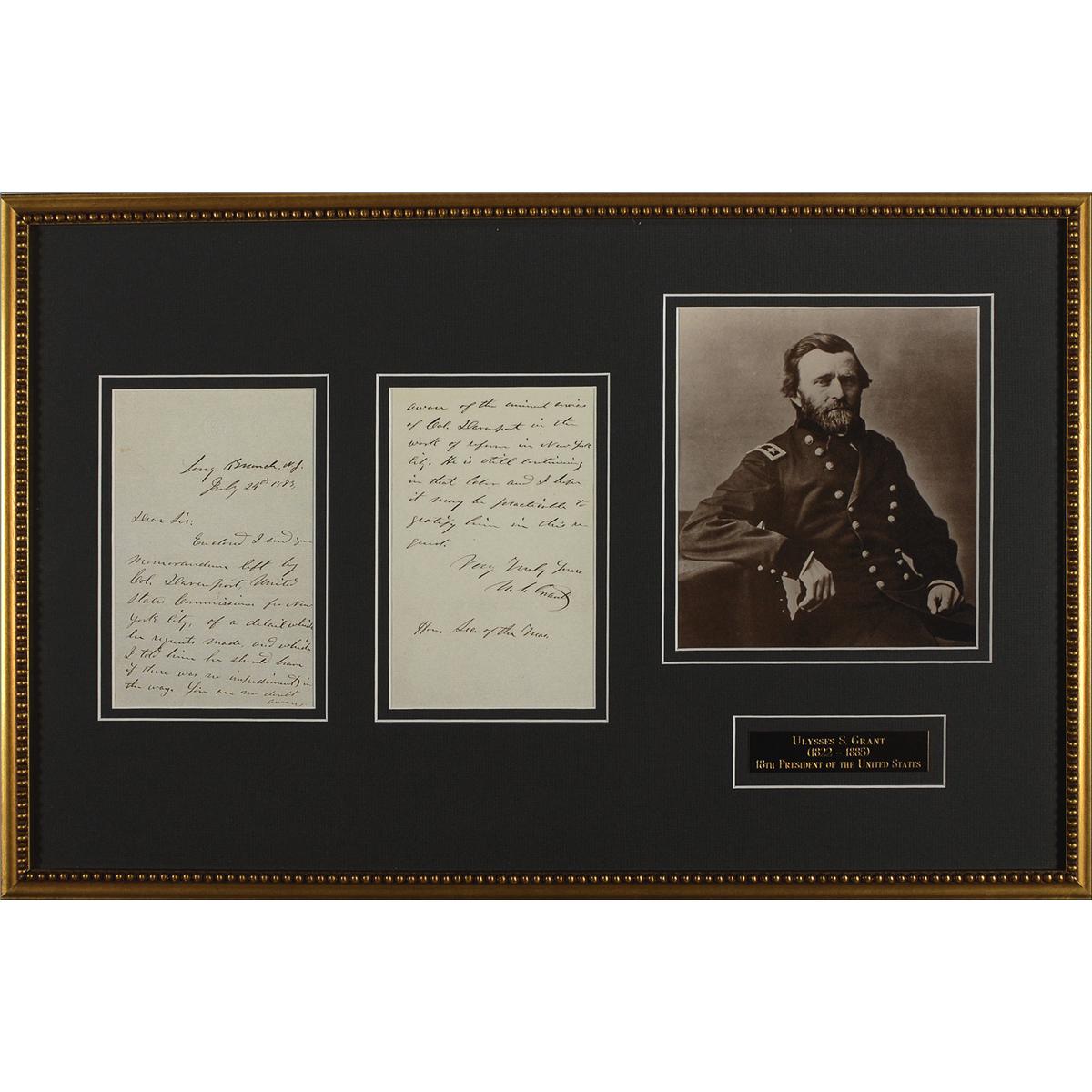 ALS as president, two pages, 5 x 7.5, personal letterhead, July 24, 1873. Letter to the Secretary of the Treasury. In full: “Enclosed I send you memorandum left by Col. Davenport, United States Commissioner for New York City, of a detail which he requests made, and which I told him he should have if there were no impediment in the way. You are no doubt aware aware [sic] of the eminent service of Col. Davenport in the work of reform in New York City. He is still continuing in that labor and I hope it may be practical to gratify him in this request.” Archivally double matted and framed with a portrait of Grant in uniform and a name plaque to an overall size of 26 x 17. In fine condition. Oversized.