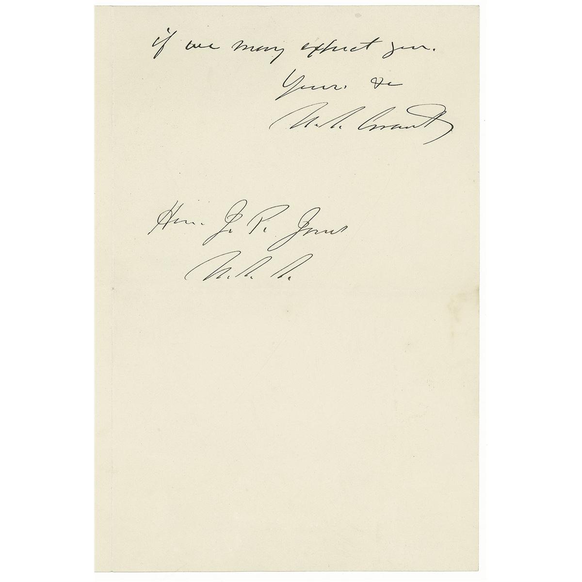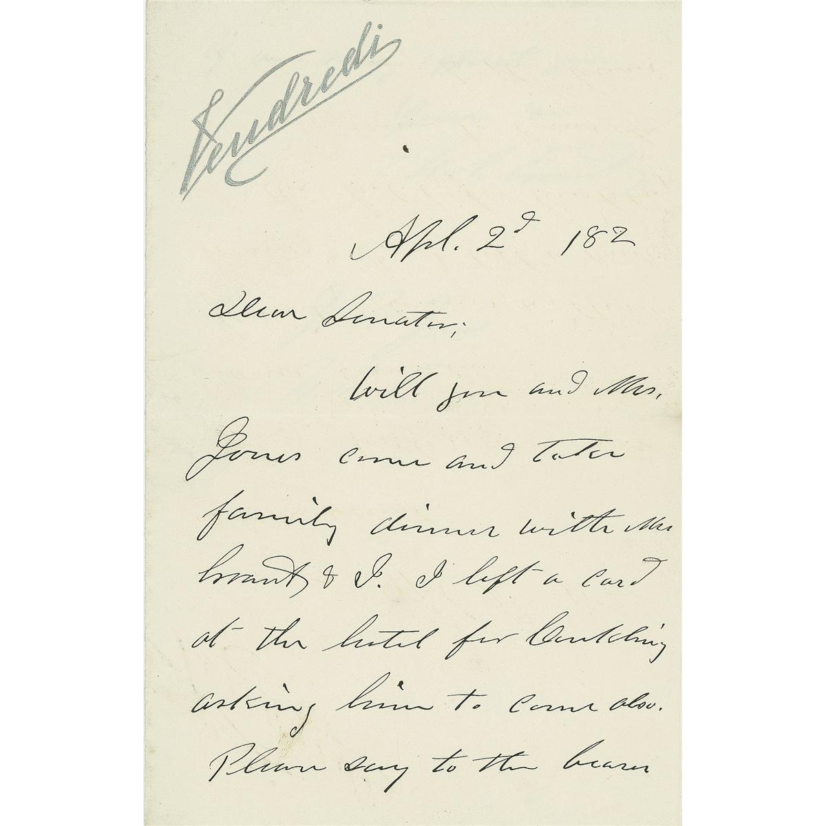 ALS, two pages on two adjoining sheets, 4.5 x 7, Vendredi letterhead, April 2, 1882. Letter to Senator J. P. Jones sending an invitation to dinner. In full: “Will you and Mrs. Jones come and take family dinner with Mrs. Grant & I. I left a card at the hotel for Conklin asking him to come also. Please say to the bearer if we may expect you.” In fine condition, with a light shade of uniform toning, and soiling to reverse of second page affecting nothing.
