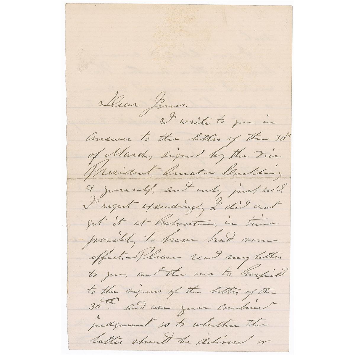 ALS, one lightly-lined page, both sides, 4.5 x 6.75, no date. Letter addressed to Jones. In full: “I write to you in answer to the letter of the 30th of March, signed by the Vice President, Senator Conkling & yourself, and only just rec’d. I regret exceedingly I did not get it at Galveston in time possibly to have had some effect. Please read my letter to you, and the one to Garfield to the signers of the letter of the 30th, and use your combined judgement as to whether the latter should be delivered or not.