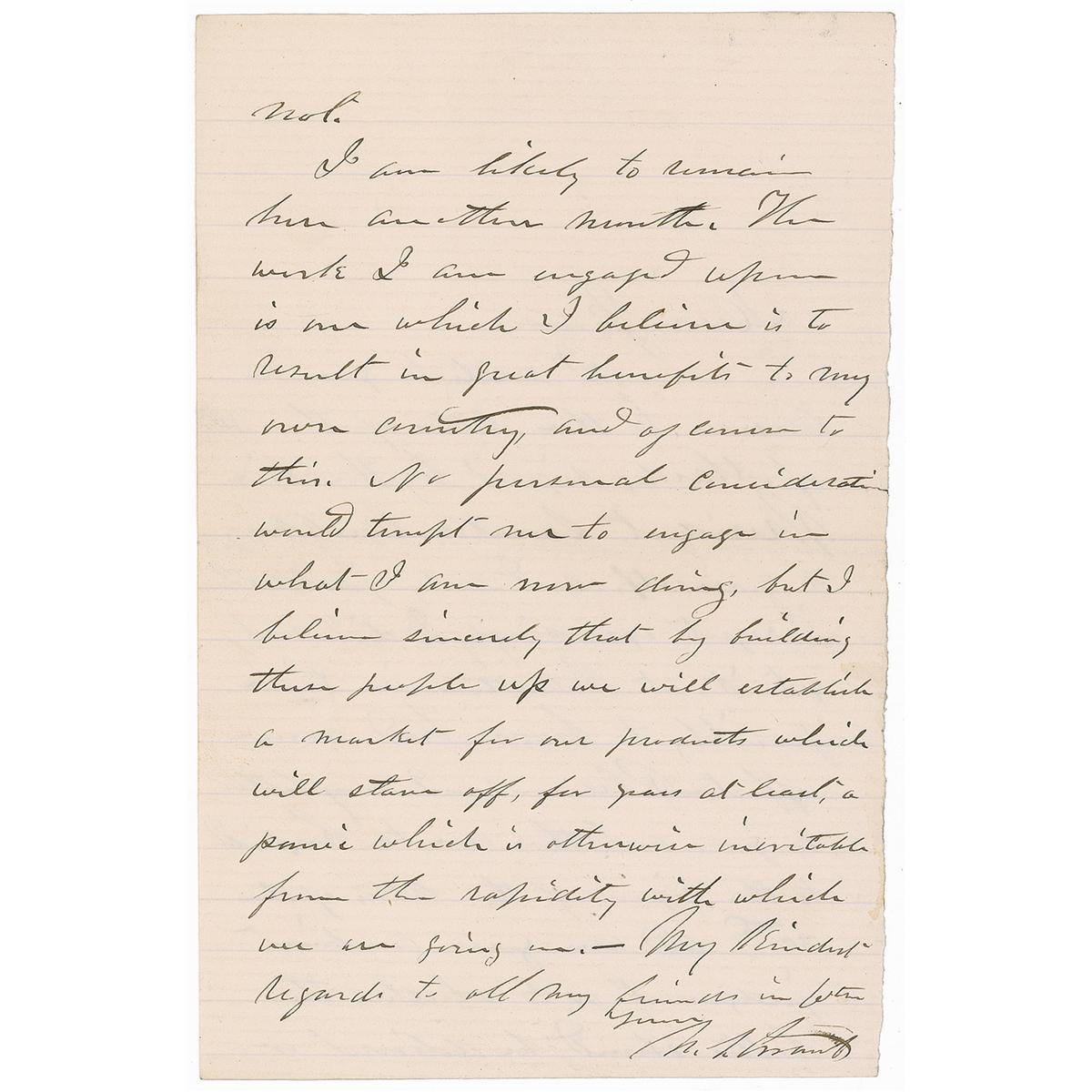 I am likely to remain here another month. The work I am engaged upon is one which I believe is to result in great benefits to my own country, and of course to this. No personal consideration would tempt me to engage in what I am now doing, but I believe sincerely that by building these people up we will establish a market for our products which will stave off, for years at least, a panic which is otherwise inevitable from the rapidity with which we are going on.” One moderate central mailing fold, otherwise fine condition.