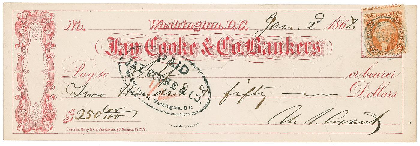 Bank check, 8.25 x 2.75, filled out and signed by Grant, payable to Self for $250.00, January 2, 1867. A two-cent revenue stamp is affixed to the top right corner. Revenue stamps were issued by the government as as means to indicate that appropriate fees had been paid. During this time period, the fees were used to pay for various expenses in the aftermath of the Civil War. In fine condition, with several cancellation cuts to body, one slightly touching top of middle initial, and a bank stamp to center.