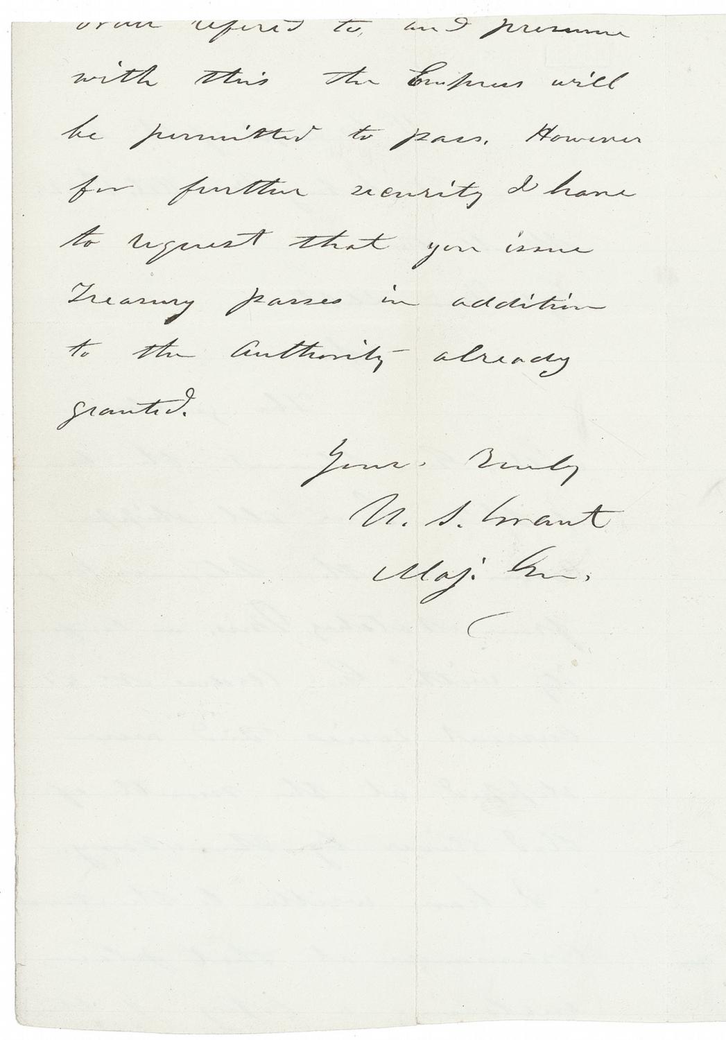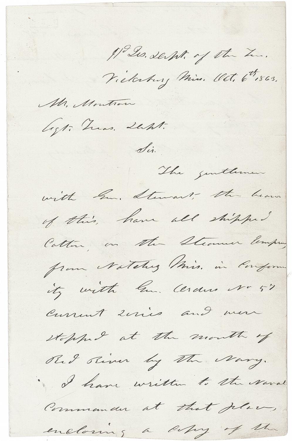 War-dated ALS signed “U. S. Grant, Maj. Gen,” one page both sides, 5.25 x 8, October 6, 1863. Letter to a Captain at the Treasury Department. In part: “The gentleman with Gen. Stewart, the bearer of this, have all shipped cotton on the Steamer Empress from Natchez, Miss.…and were stopped at the mouth of the Red River by the Navy. I have written the Naval Commander at that place, enclosing a copy…and I presume with this the Empress will be permitted to pass. However, for further security I have to request that you issue Treasury passes in addition to the authority already granted.” Lightly trimmed top and bottom edge, lightly affecting a few words at top of page, intersecting folds, one through a single letter of signature, and a bit of scattered light toning, otherwise fine condition. Shortly before this letter, Grant had just been appointed in charge of the new Military Division of the Mississippi to break the siege at Chattanooga, making Grant the commander of all Western Armies. Grant’s victory eliminated the last Confederate control of Tennessee and opened the door to an invasion of the Deep South.