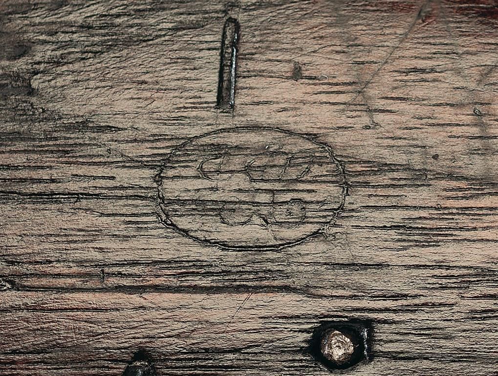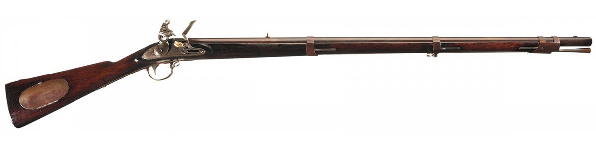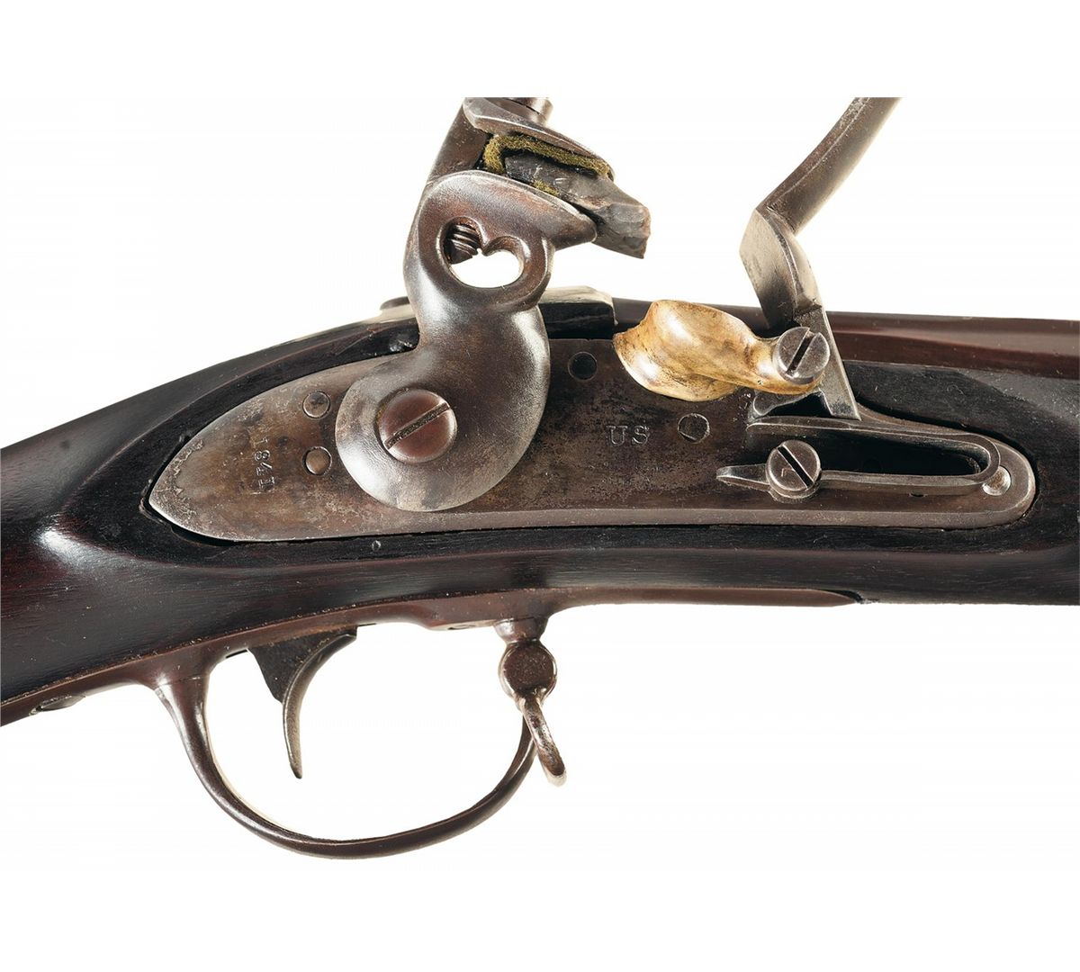 Fair as refinished and reconverted to flintlock with most of the brown finish remaining. The lock and hammer have a smooth dark patina. The stock has been freshened and remains very good with a pieced in repair on the upper right side ahead of the lock and overall some scattered minor dents and dings. The rear barrel band spring is in the down position. The maker's mark on the lock is partially visible and the remaining markings are clear. There is some play in the hammer, otherwise the action is fine.