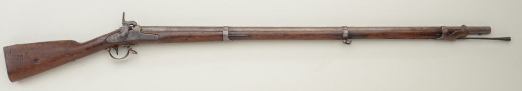 U.S. Harper’s Ferry single shot military  rifle converted to percussion, lock plate  dated 1851, .70 cal., 42” barrel, full wood  stock, sling swivels. This gun is in overall  good condition showing a brown patina onmetal surfaces, moderate pitting around  firing area, good markings on the lock plate,  good action, wood stock is overall fair to  good with scattered mars and scratches from  carry and storage and an old repair to thewrist area; flared tip iron ramrod that  extends beyond the muzzle and is old but not  original to this gun; right side of butt  stock shows old “M L” initials; left side of  stock shows remnants of inspector’scartouche.  Est.:  $300-$500.