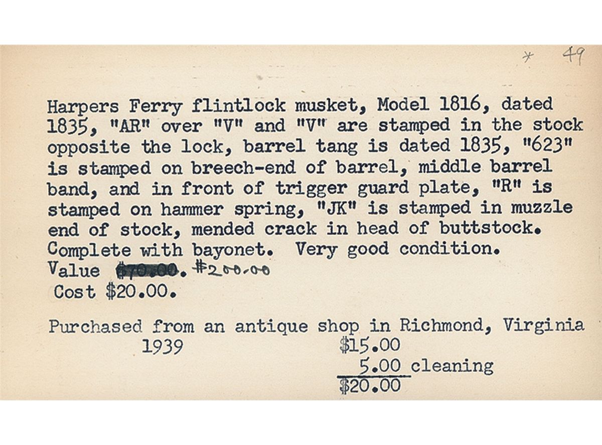 This example was manufactured between 1831 and 1844. Marked vertically at the rear of the lock plate "HARPERS/FERRY/1835" with the "eagle/shield" above "US" between the hammer and the flash pan. The top left breech end of the barrel is stamped with the number "623" and with the "V/P/eagle head" proofmark and the letter "V" on the left flat. The number "623" is also stamped on top of the middle barrel band and ahead of the trigger guard on the trigger guard plate. The barrel tang is dated 1835. There is the letter "R" stamped on the bottom of the hammer spring. Mounted on a full length walnut stock with the left flat stamped with a faint "AR" and two "V"s and the buttplate tang is marked "US". Comes with an original button head steel ramrod.