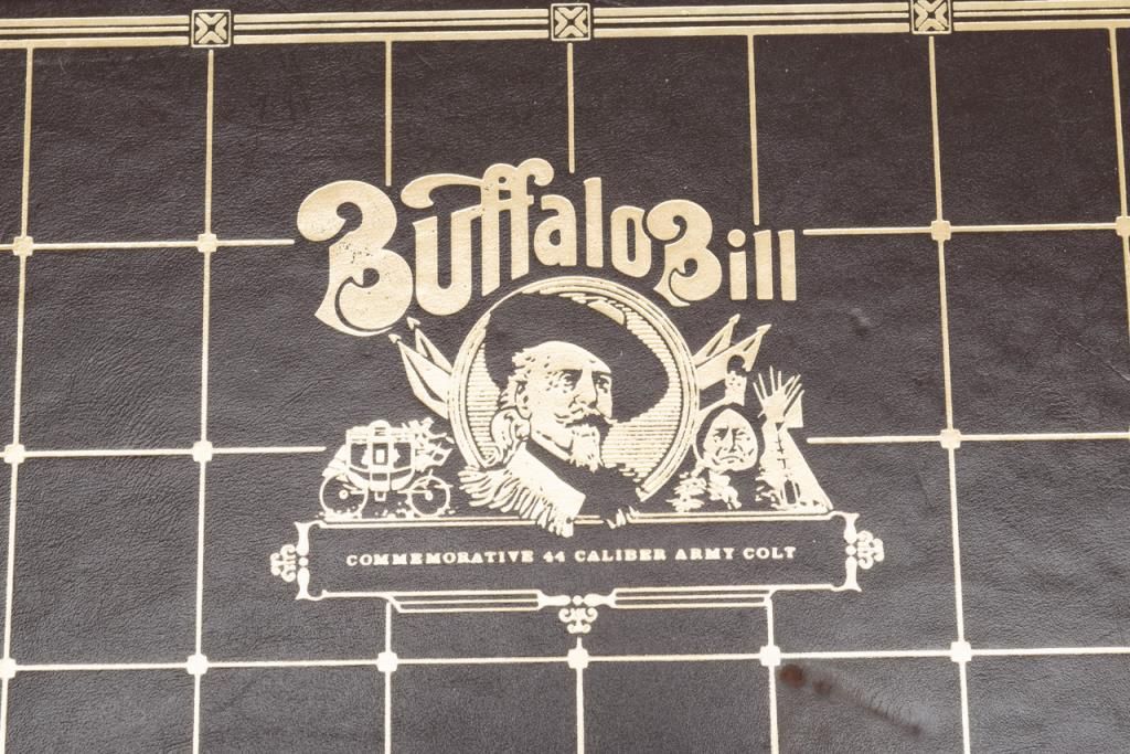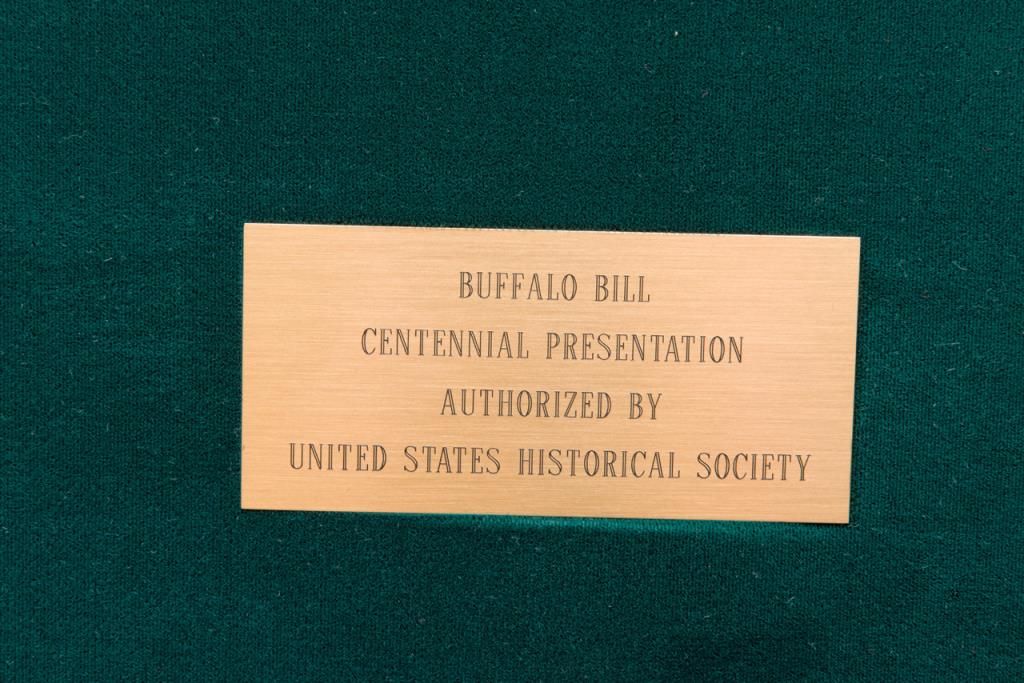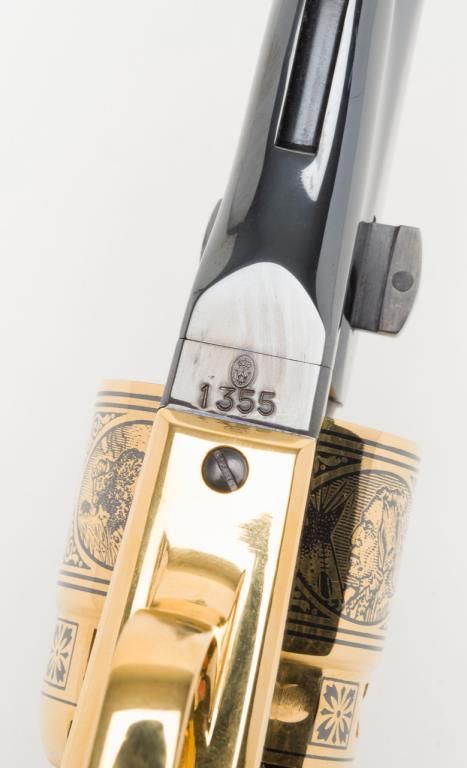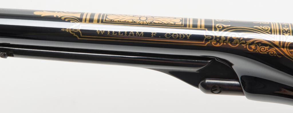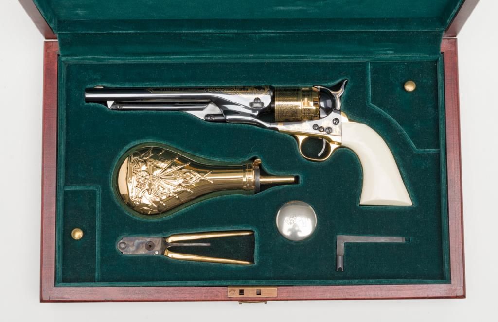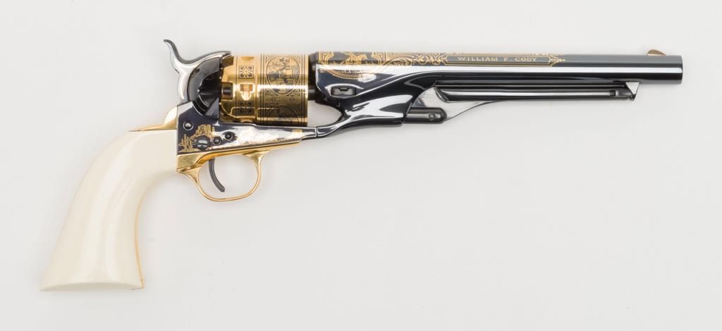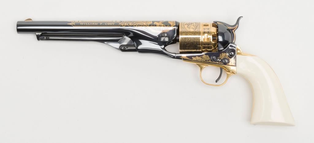 U.S. Historical Society Authorized Buffalo Bill Centennial Presentation copy of a Colt Model 1860 Army percussion revolver, .44 cal., 8” barrel, blue finish with gold ornamentation, faux ivory grips, #1355 in like new condition showing littlehandling, accompanied by a deluxe green French lined wood case with accessories including a stand-of-flags gold plated powder flask, a combination nipple wrench/screwdriver, a polished brass bullet mold, a percussion cap tine withengraved buffalo on the lid and two covered compartments, one containing lead balls. The lid of the casing has a leather inset with the likeness of Cody himself in the center flanked by a stagecoach and the likeness of the great Indianwarrior, Sitting Bull. Also accompanying lot is a certificate of authenticity numbered to this gun along with other paperwork from the U.S. Historical Society. (Exempt-modern percussion). Est.: $800-$1,600.