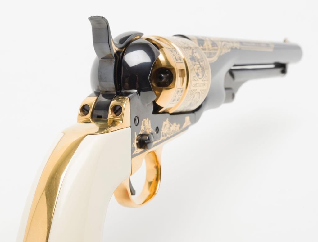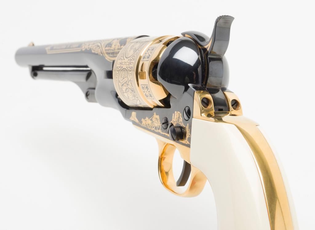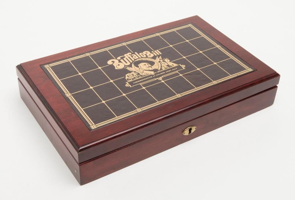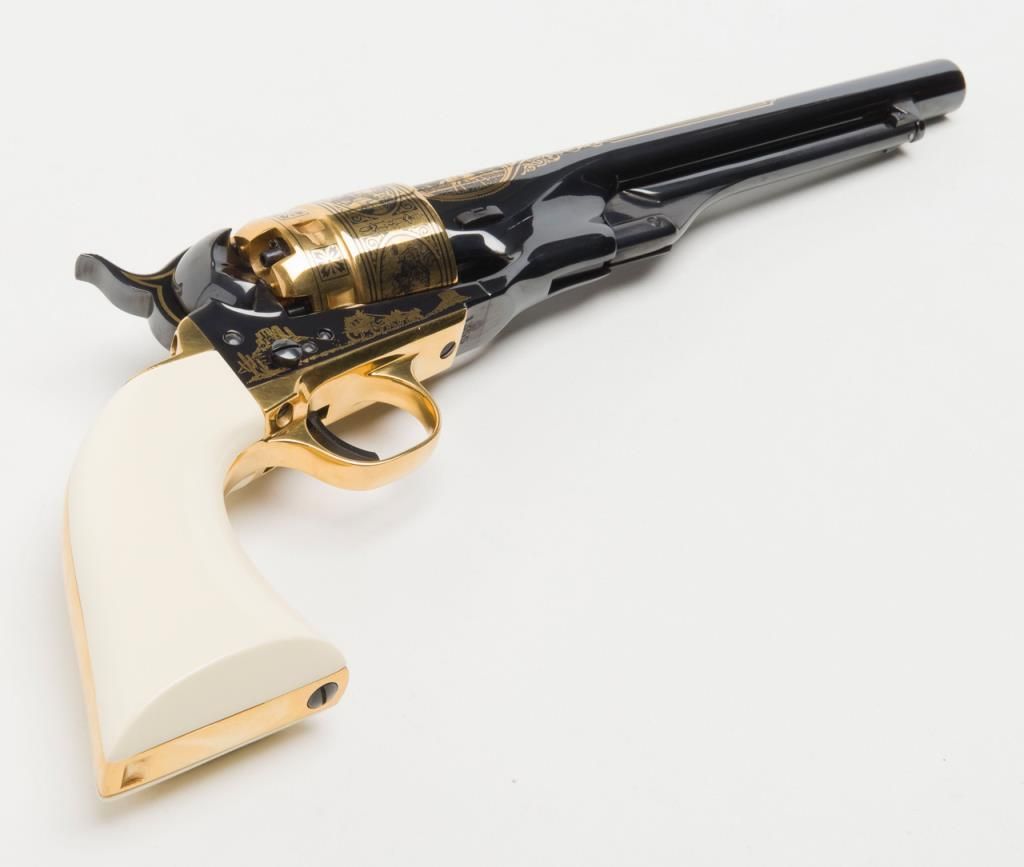 U.S. Historical Society Authorized Buffalo Bill Centennial Presentation copy of a Colt Model 1860 Army percussion revolver, .44 cal., 8” barrel, blue finish with gold ornamentation, faux ivory grips, #1355 in like new condition showing littlehandling, accompanied by a deluxe green French lined wood case with accessories including a stand-of-flags gold plated powder flask, a combination nipple wrench/screwdriver, a polished brass bullet mold, a percussion cap tine withengraved buffalo on the lid and two covered compartments, one containing lead balls. The lid of the casing has a leather inset with the likeness of Cody himself in the center flanked by a stagecoach and the likeness of the great Indianwarrior, Sitting Bull. Also accompanying lot is a certificate of authenticity numbered to this gun along with other paperwork from the U.S. Historical Society. (Exempt-modern percussion). Est.: $800-$1,600.