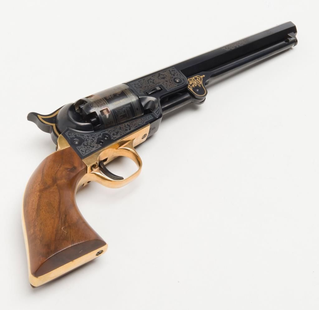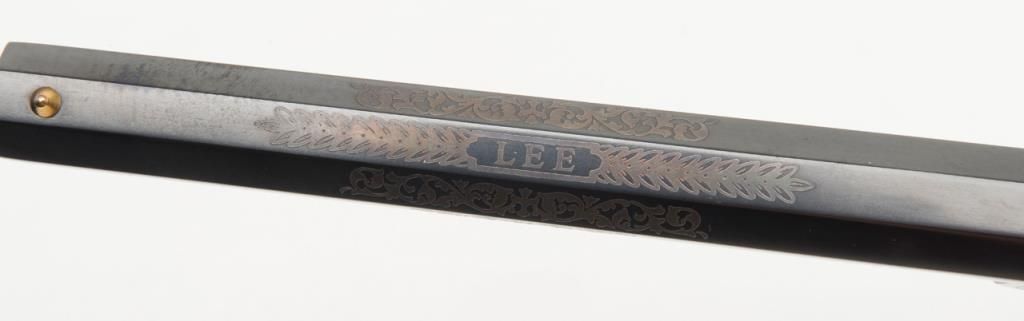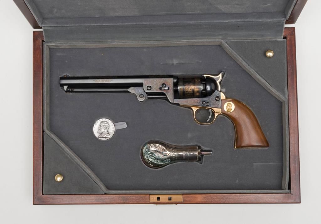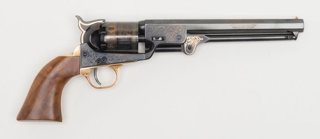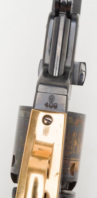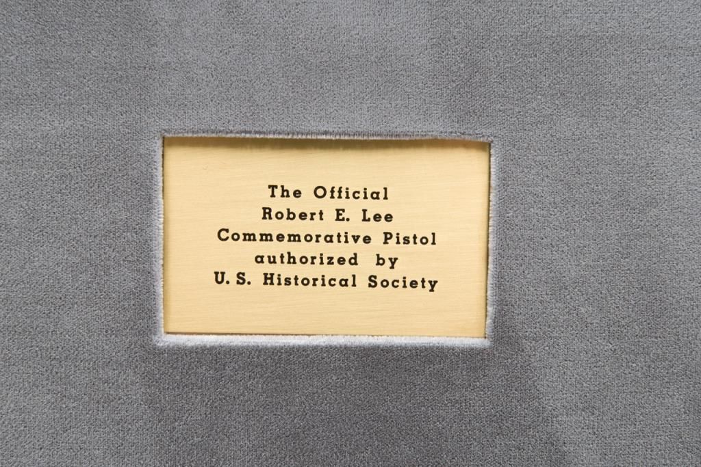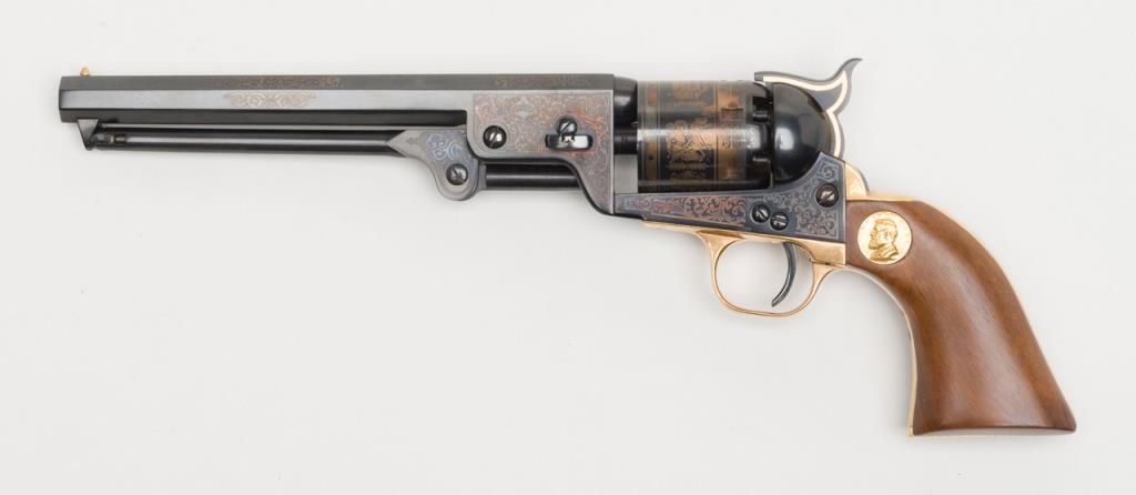 U.S. Historical Society Authorized “The Official Robert E. Lee Commemorative Pistol” copy of a Colt Model 1851 Navy percussion revolver, .36 caliber, 7-1/2” octagon barrel, blue finish, gold ornamentation, wood grips with medallion on leftgrip of Lee’s profile, #409 in like new condition showing little handling; accompanied with a presentation French lined wood case with reproduction eagle mold, Robert E. Lee medallion and cap tin with Lee’s signature facsimile on thelid; the case is in fine condition with a leather inset in the lid decorated with the General astride his favorite horse. Also with this lot is a letter from the U.S. Historical Society, a Certificate of Authenticity numbered to this gunand other documentation from the Society. (Exempt/Modern-percussion). Est.: $800-$1,600.