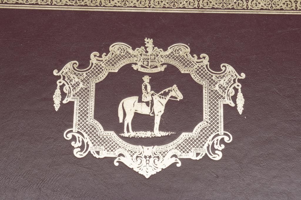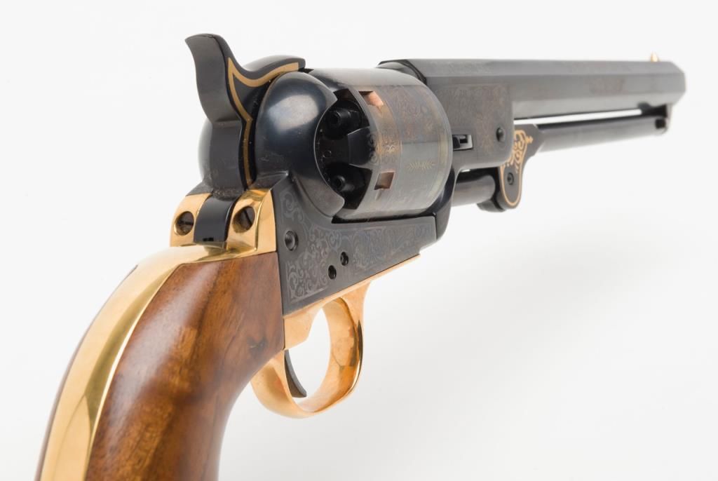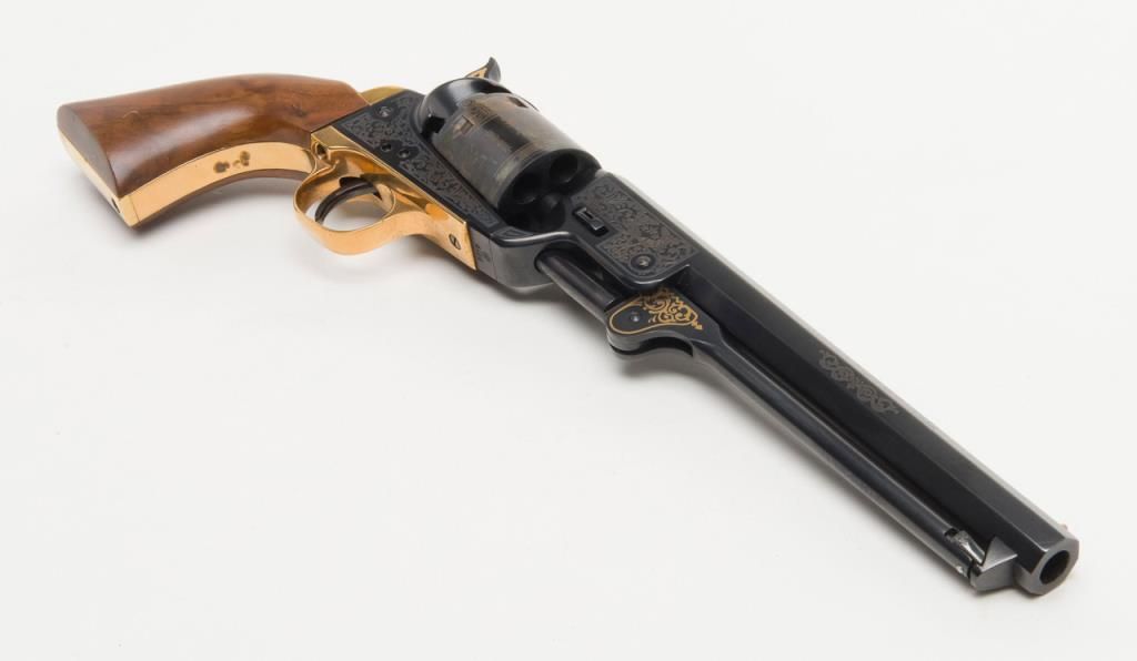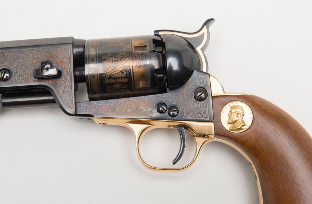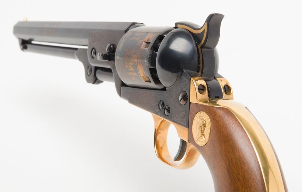 U.S. Historical Society Authorized “The Official Robert E. Lee Commemorative Pistol” copy of a Colt Model 1851 Navy percussion revolver, .36 caliber, 7-1/2” octagon barrel, blue finish, gold ornamentation, wood grips with medallion on leftgrip of Lee’s profile, #409 in like new condition showing little handling; accompanied with a presentation French lined wood case with reproduction eagle mold, Robert E. Lee medallion and cap tin with Lee’s signature facsimile on thelid; the case is in fine condition with a leather inset in the lid decorated with the General astride his favorite horse. Also with this lot is a letter from the U.S. Historical Society, a Certificate of Authenticity numbered to this gunand other documentation from the Society. (Exempt/Modern-percussion). Est.: $800-$1,600.