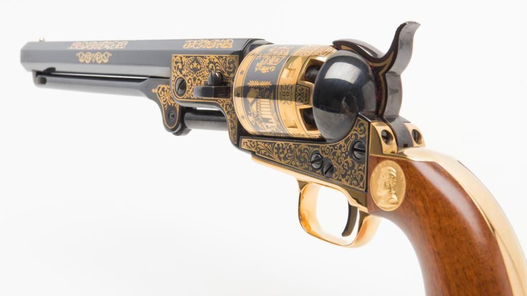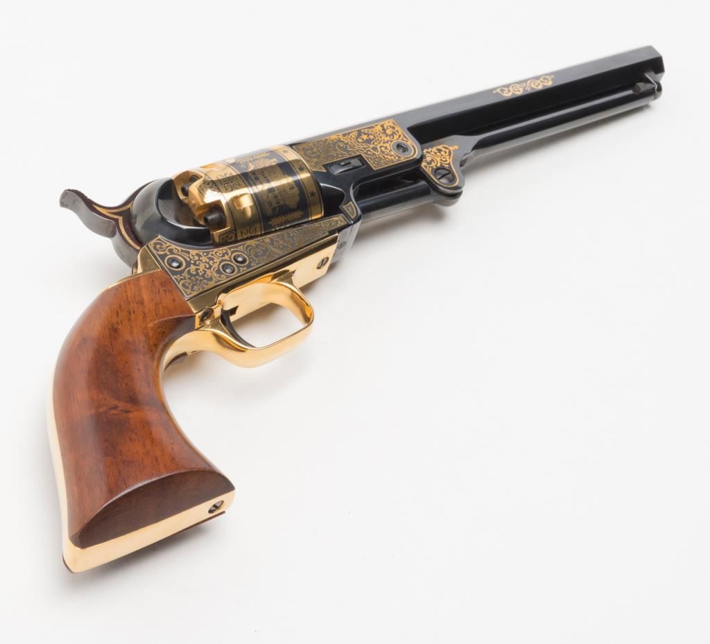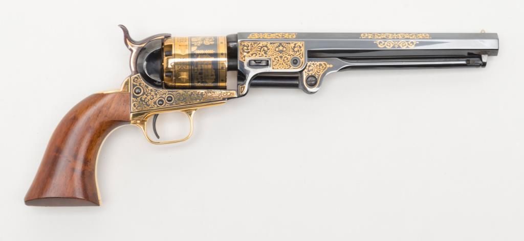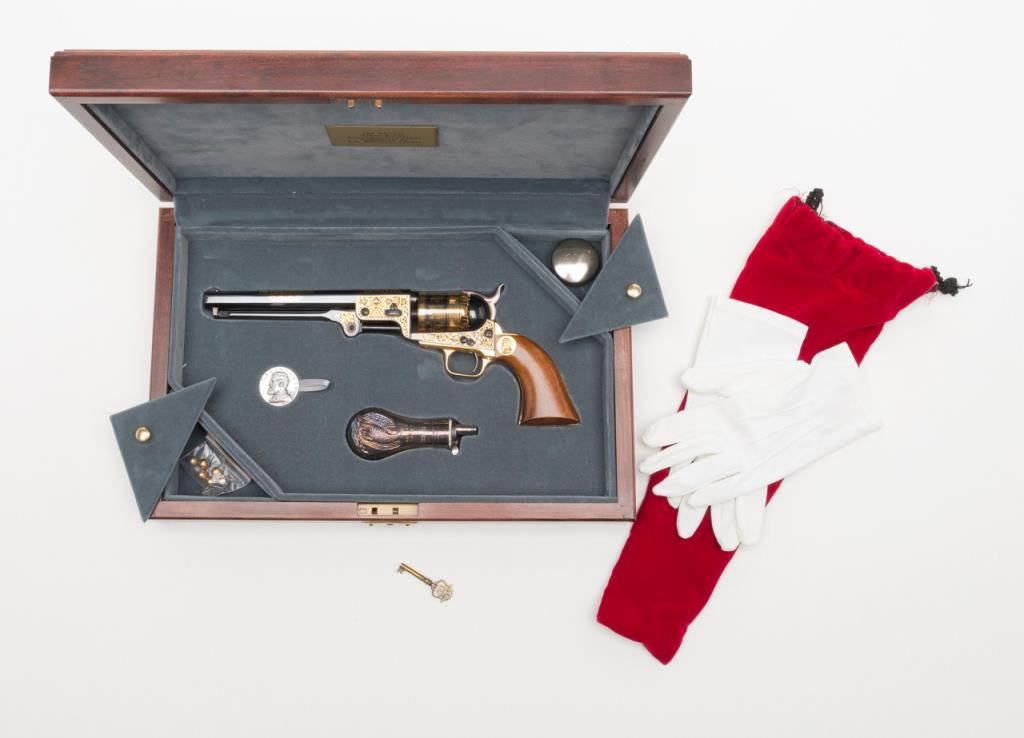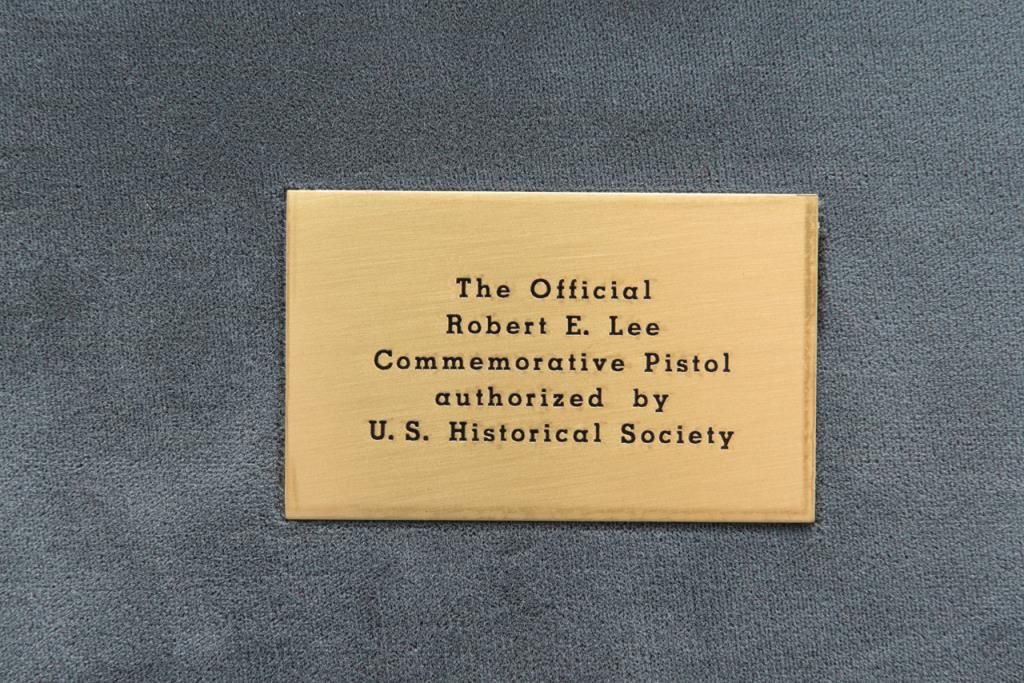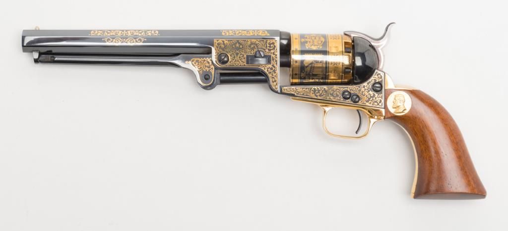 U.S. Historical Society Robert E. Lee Commemorative Navy percussion revolver, .36 cal., 7-1/2” octagon barrel, blue finish with gold ornamentation, wood grips with gold medallion inset in left grip with profile of Lee, #1748 inlike new condition showing little handling; accompanied by a custom wood display case with lined interior, medal with the General’s likeness embossed on surface, reproduction spread eagle metal powder flask, metal cap tin, pistol ballsand key to the casing; white gloves for handling the piece are also included along with a red velvet bag; the lid of the display case is inset with a leather panel that has a gold trim and center gold ornamentation showing General Leeastride his favorite horse. Est.: $400-$800.