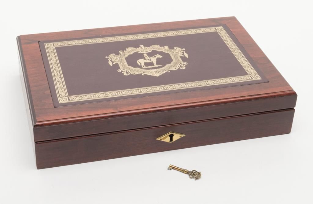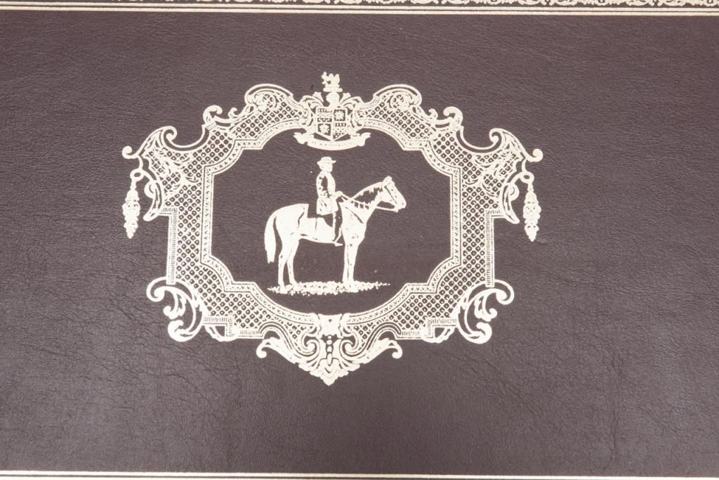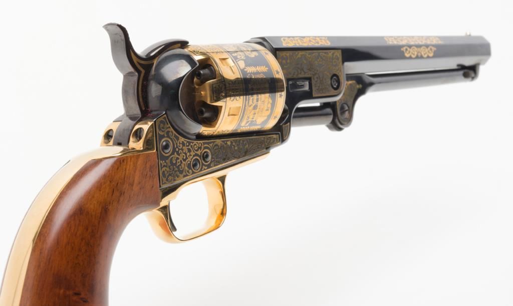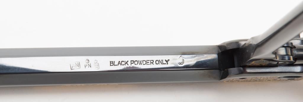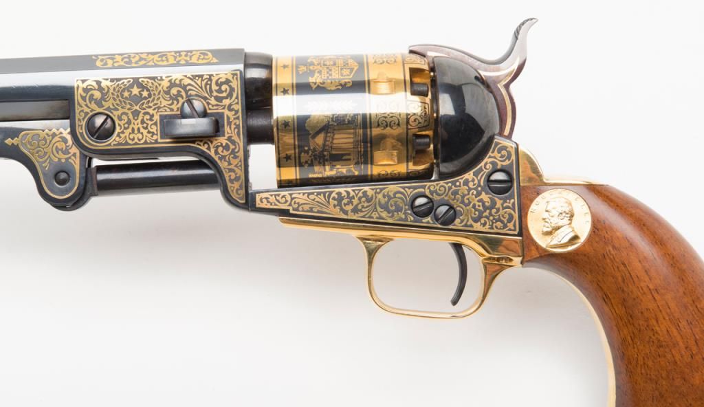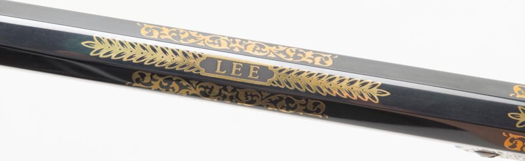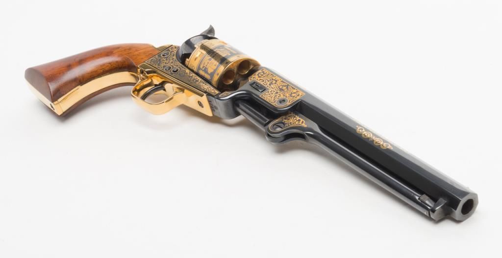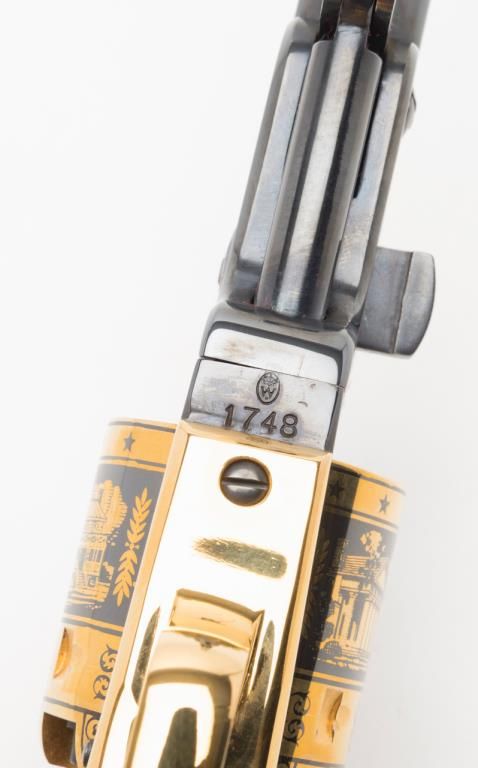 U.S. Historical Society Robert E. Lee Commemorative Navy percussion revolver, .36 cal., 7-1/2” octagon barrel, blue finish with gold ornamentation, wood grips with gold medallion inset in left grip with profile of Lee, #1748 inlike new condition showing little handling; accompanied by a custom wood display case with lined interior, medal with the General’s likeness embossed on surface, reproduction spread eagle metal powder flask, metal cap tin, pistol ballsand key to the casing; white gloves for handling the piece are also included along with a red velvet bag; the lid of the display case is inset with a leather panel that has a gold trim and center gold ornamentation showing General Leeastride his favorite horse. Est.: $400-$800.