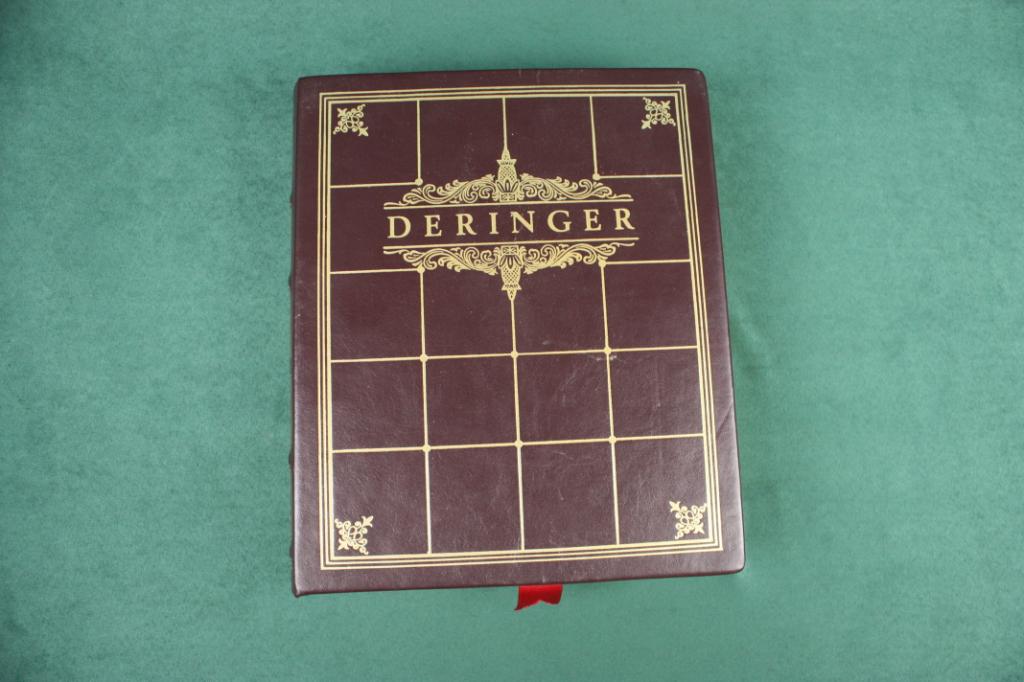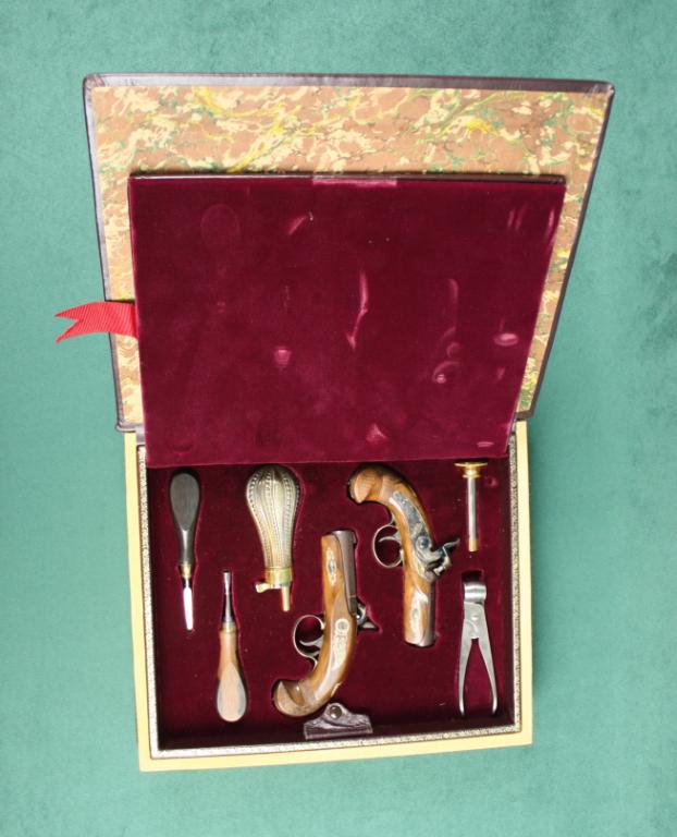 U.S. Historical Society pair of Philadelphia  Deringer replicas, #987A and 987B, 2" double  banded barrels, engraved, silver plated  trigger guards, checkered stocks with  escutheons and cap boxes.  Set is in fine toexcellent, in a "book" case with bullet  starter, flask, mold and screwdrivers.  Case  is lined in burgundy felt and is in very good  condition, leather cover shows minor nicks  and scratches from storage and display.Silver on trigger guard has drifted to a nice  patina.  Est. $400-800.