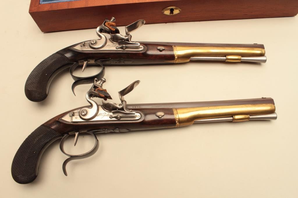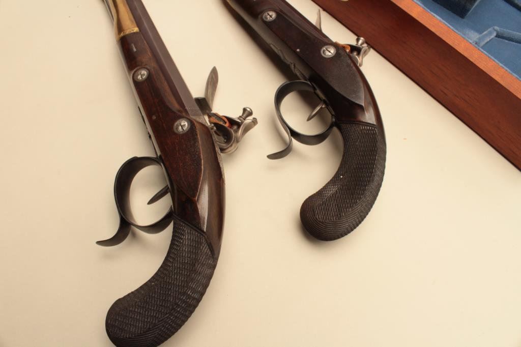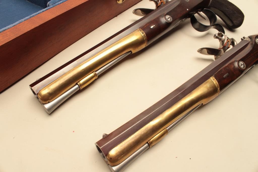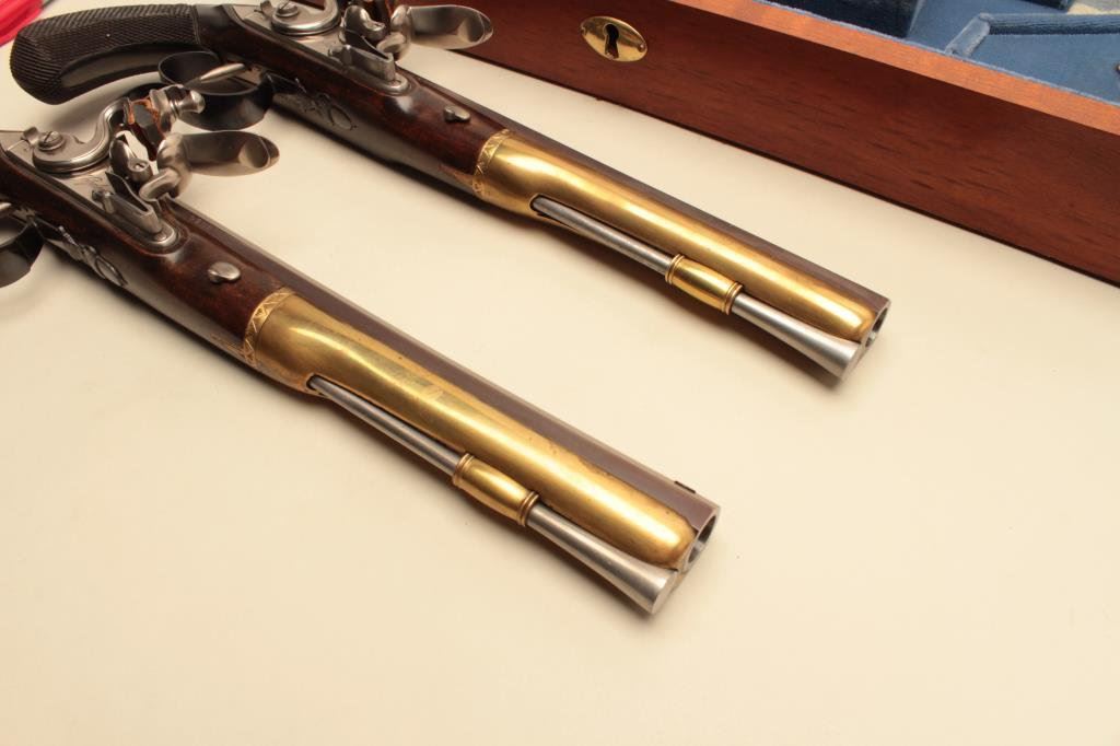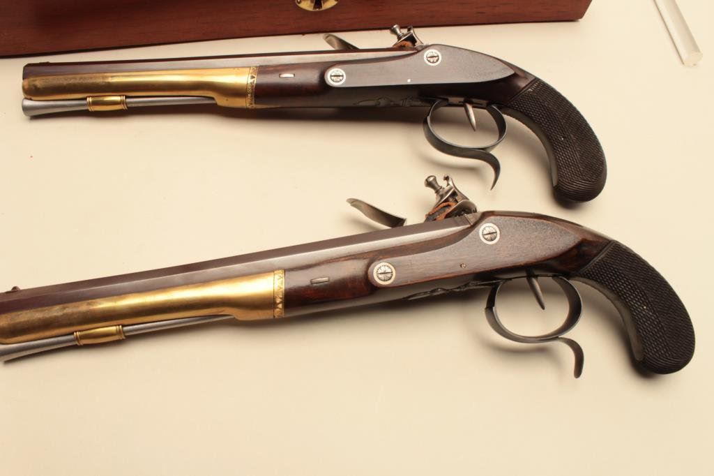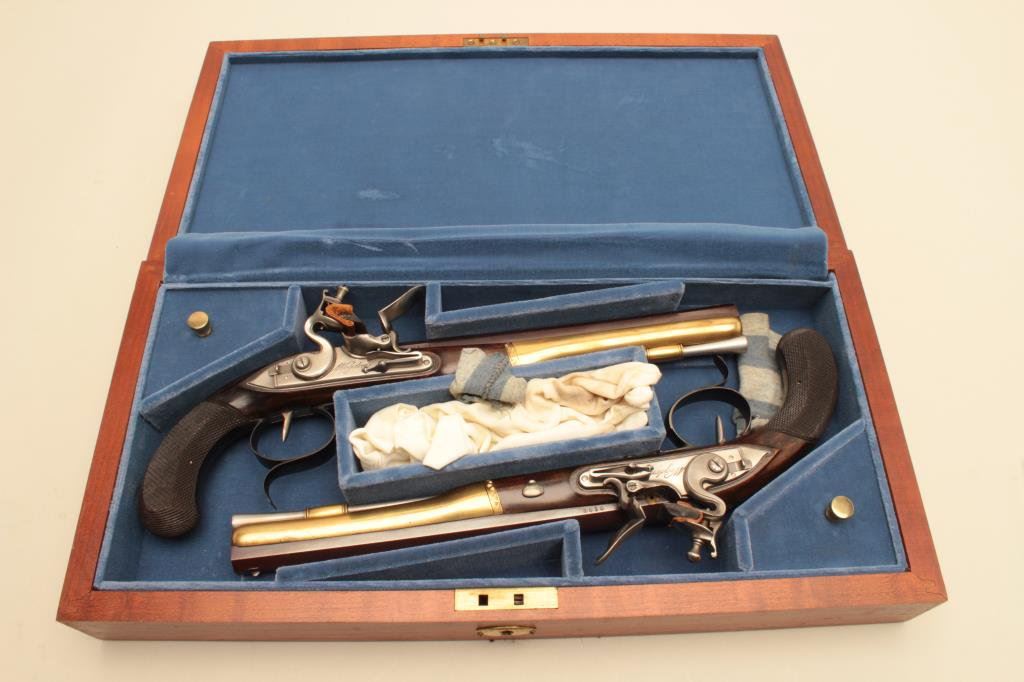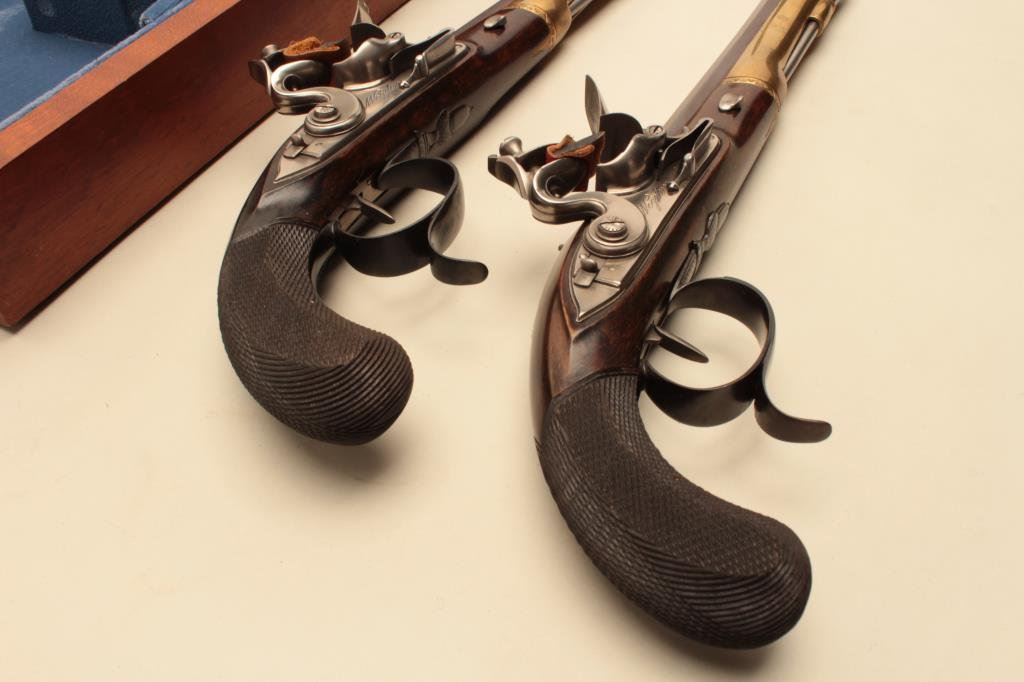 Burr Wogdon Flintlock Dueling Pistols in overall fine condition showing little handling; with Certificate of Authenticity (#919). (Flintlock). Est.: $900-$1,800.