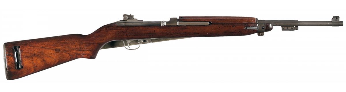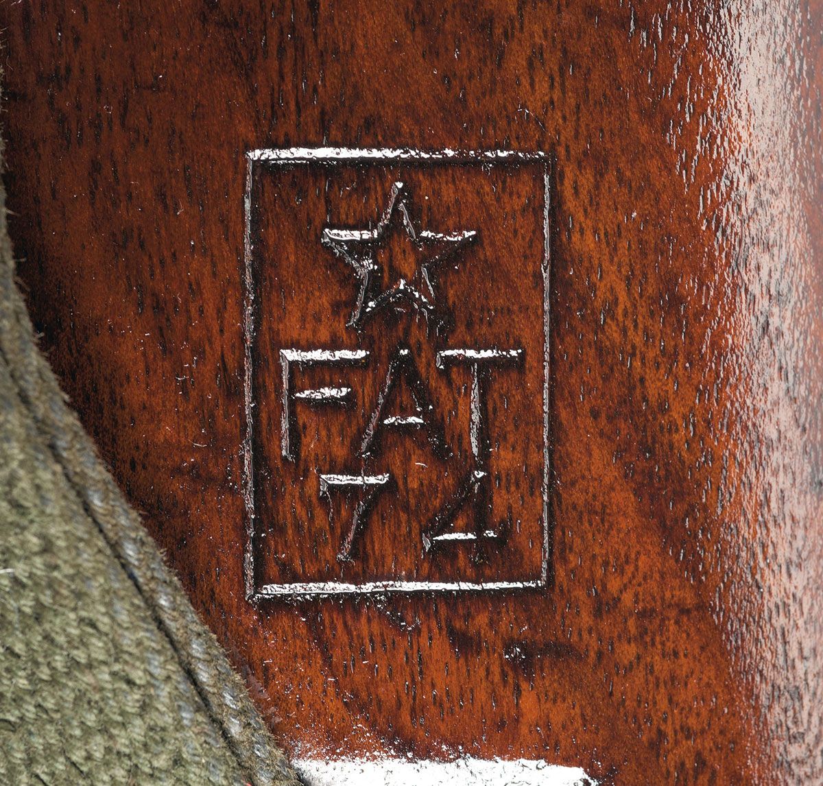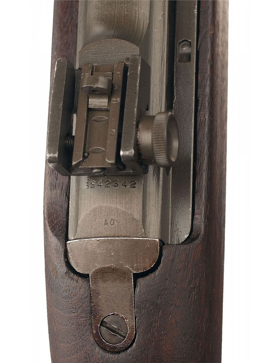"AO" subcontractor mark on rear receiver. Barrel marked "ROCK-OLA" without a date. Blade front sight marked with a "V" and an adjustable type III rear sight marked with an "HI" on the right side. Type III barrel band marked "JI" with bayonet lug. Standard receiver marking with "AO" at the rear (This stands for Auto Ordnance Corp). Flip type safety with push button magazine release marked "MWA". Low wood stock with two rivet handguard, oval oiler cutout and checkered steel buttplate. Markings stamped in the sling cutout with a small letter being a possible "P" followed by unreadable larger letter. A box cartouche is on the left side of stock marked star/"FAT"/"74". Missing magazine.