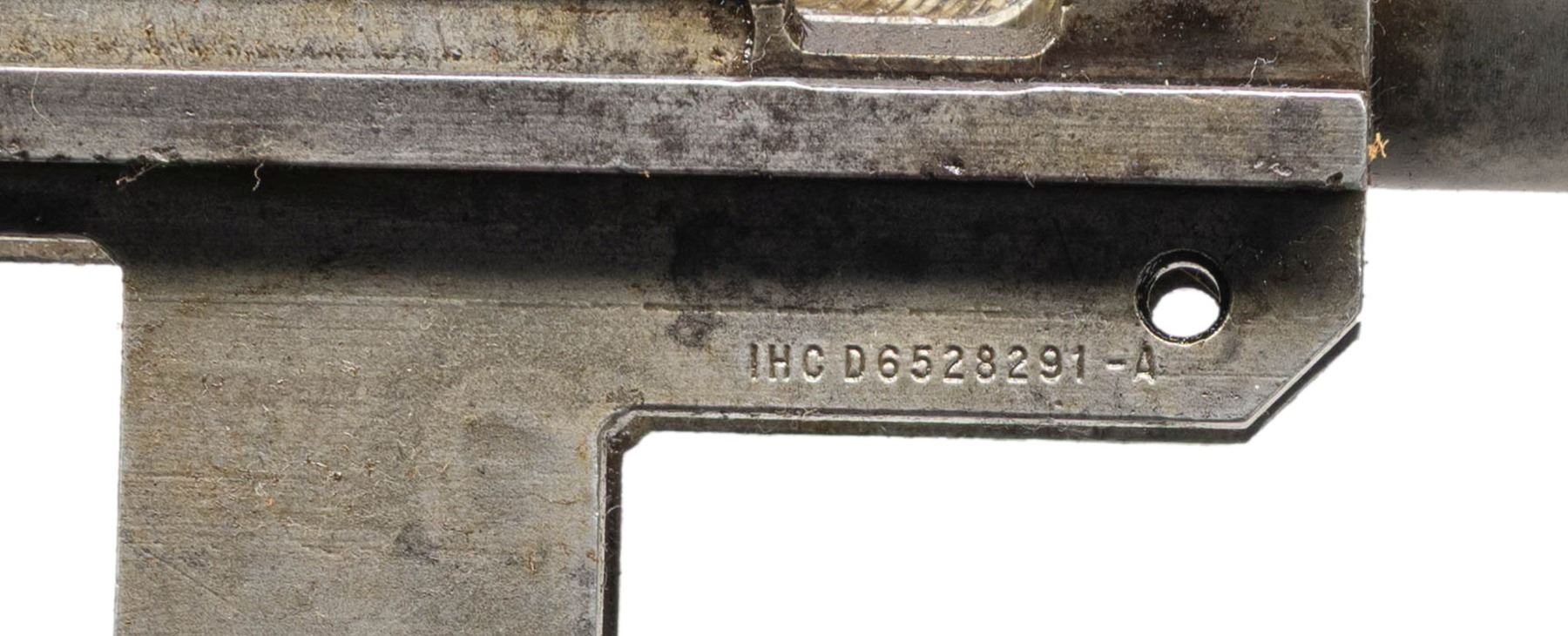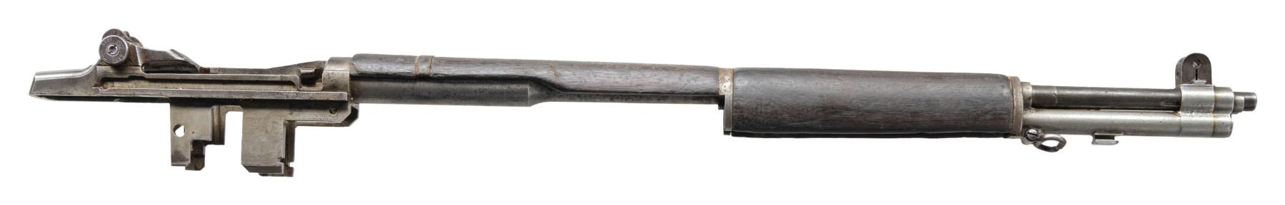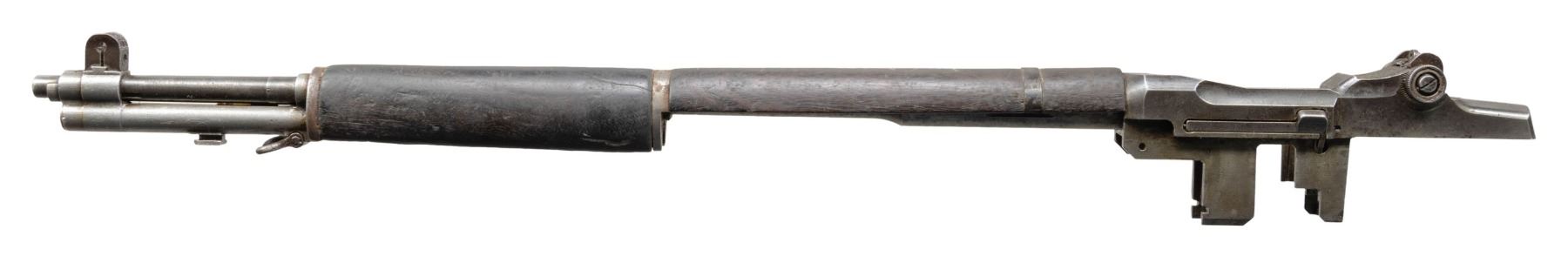 BARREL AND PARTS. Cal. 30-06. S# 4496988. Bbl. 24". Barrel markings on right side include "LMR 11 53" & import marks. Throat gauges 3.0. Muzzle gauges 1.0. Receiver carries standard markings at heel & is marked "IHC D6528291-A" at the right front end. T105E1 aperture rear sight. Blade front sight w/ protective ears. Group includes walnut front & rear handguards w/ furniture, gas cyl., stacking swivel, gas cyl. lock & gas cyl. lock screw. CONDITION: rifle appears to be dismantled after long hard service. Handguards have extensive wear, staining & handling marks w/ notable crack on left side of front handguard. Worn metal turning gray & patina w/ spots of oxidation & fine pitting. Bore has strong sharp lands w/ hint of frosting. (25-4407/RW). MODERN. $200-300.