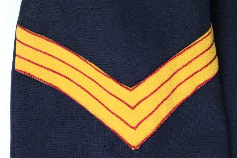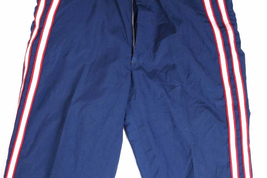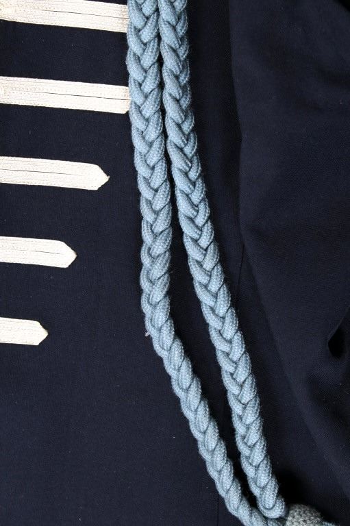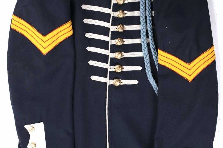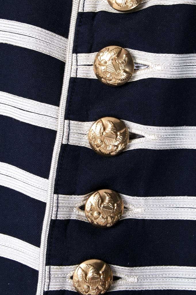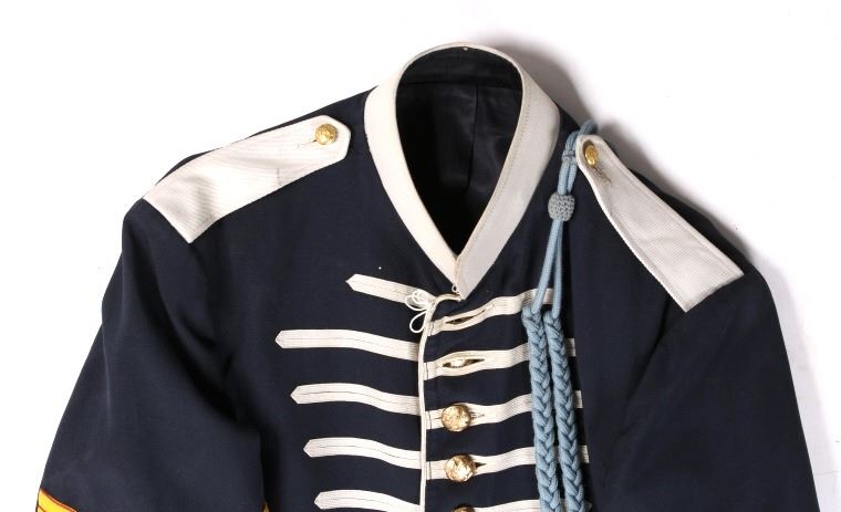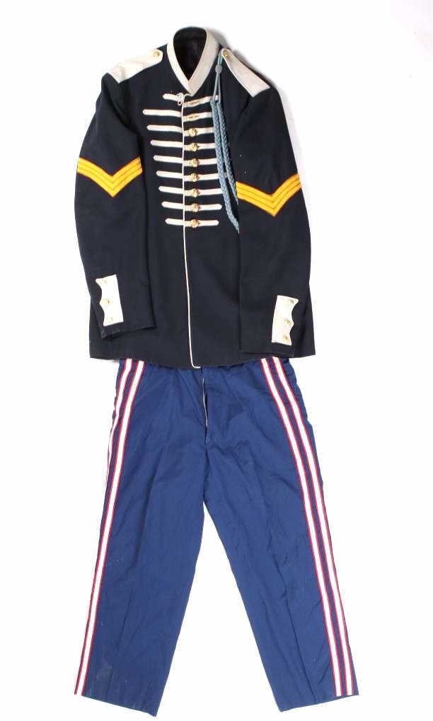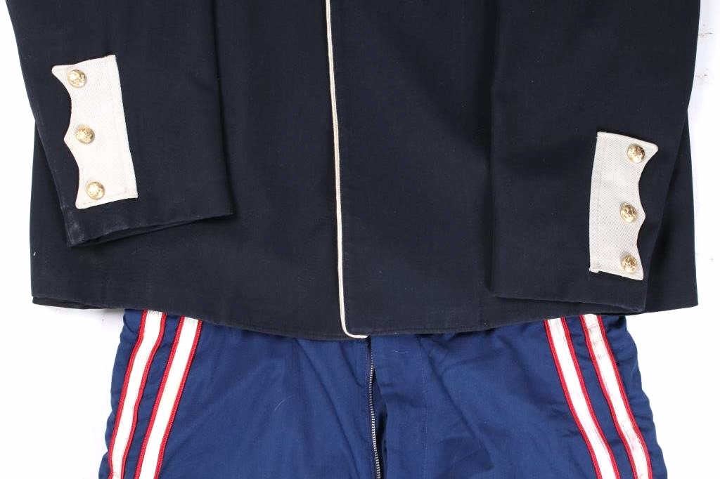 Included in this lot we have a U.S. Infantry dress uniform coat with blue cord and pants originating from the 1890's to 1900's. The coat shows a navy blue fabric construction with white collar, epaulettes, cuff accents, and button stripes. Each arm shows a gold and red arrow style bars and three brass buttons on the cuff. The front of the piece shows white button stripes with nine brass buttons decorated with a eagle and shield. The jacket displays a infantry blue cord on the left shoulder under the epaulette. The pants show a dark blue color with red and white stripes going down the outside seam of both legs. The jacket is free of tags or markings with the pants showing a faded size tag. The set shows good condition overall with spots of wear. The jacket measures 18 1/2" across the shoulder by 29 3/4" from shoulder to bottom of the coat and 27 1/4" from the shoulder to the end of the sleeve and the pants measure 36x31.