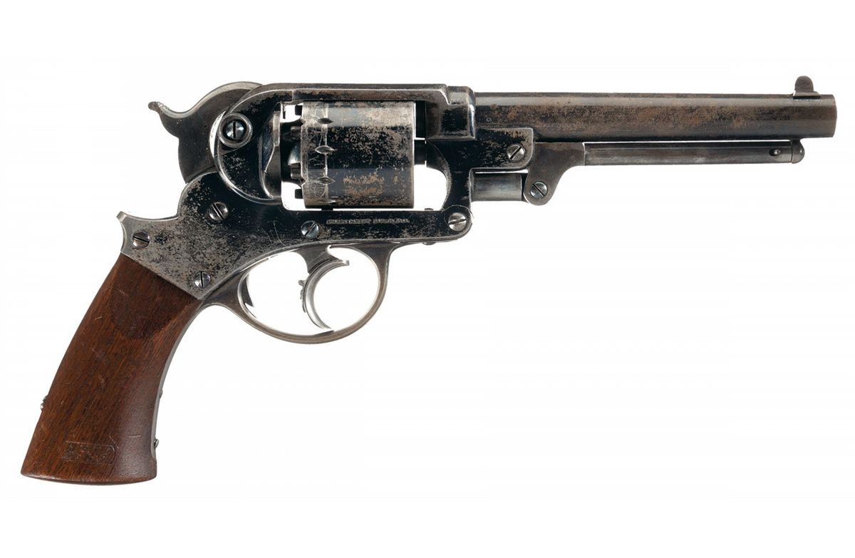 Manufactured circa late 1850s to early 1860s. The left side of the frame has the one line address and the right side has the one line 1856 patent date marking. Single letter inspector marks are stamped on most of the components. Matching numbers on frame, cylinder and hammer well with the number "14252" on the hammer. Fitted with a smooth grip stamped with a boxed script letter cartouche on both sides and the inspector mark "C" on the underside.