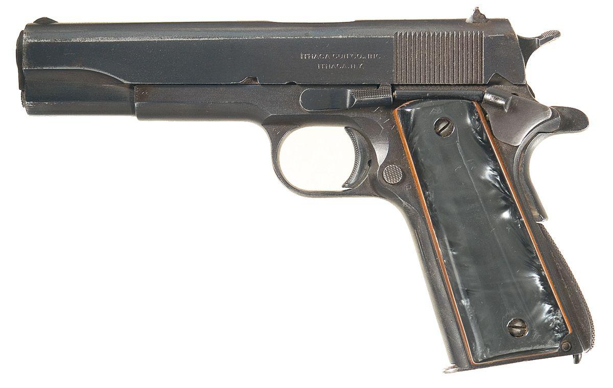 Made in 1944. Standard markings, with addition of British proofs. Atwood inspected, checkered small parts, arched mainspring housing, aftermarket grips and High Standard barrel.