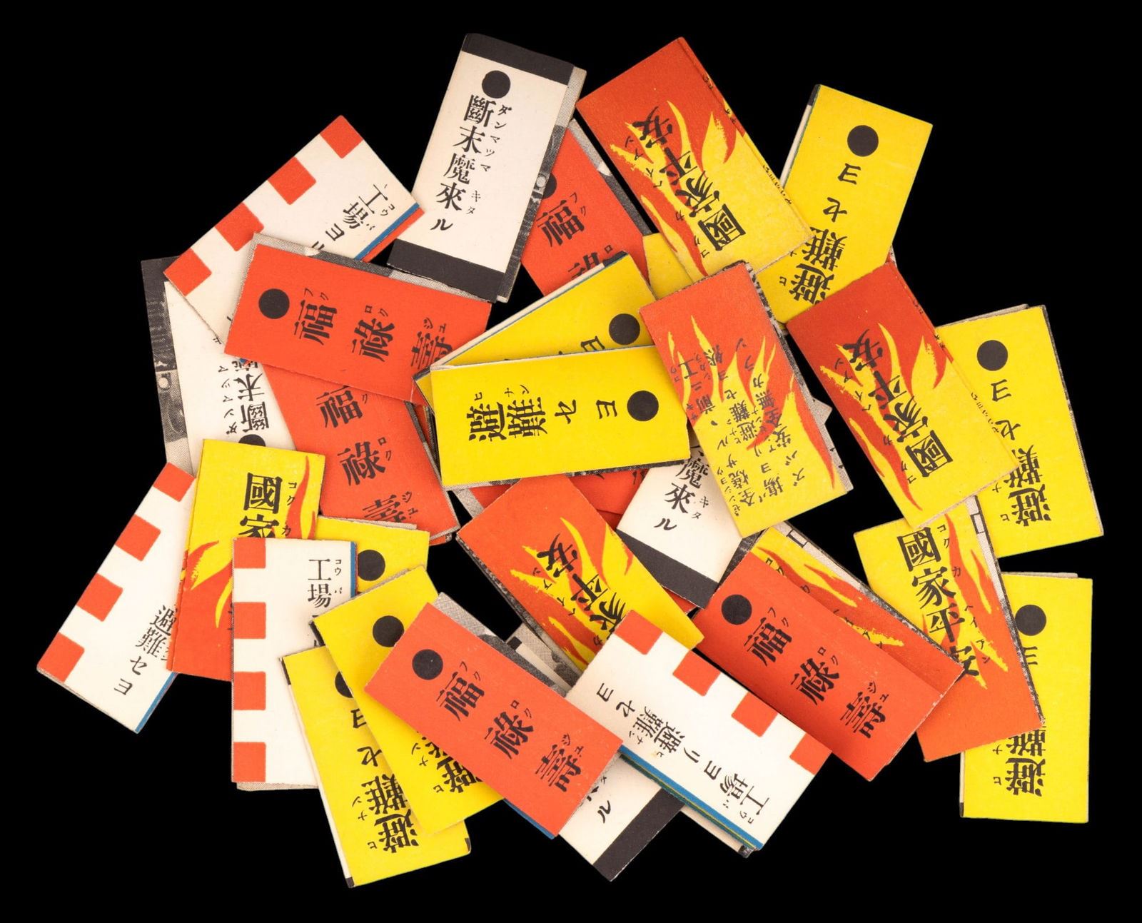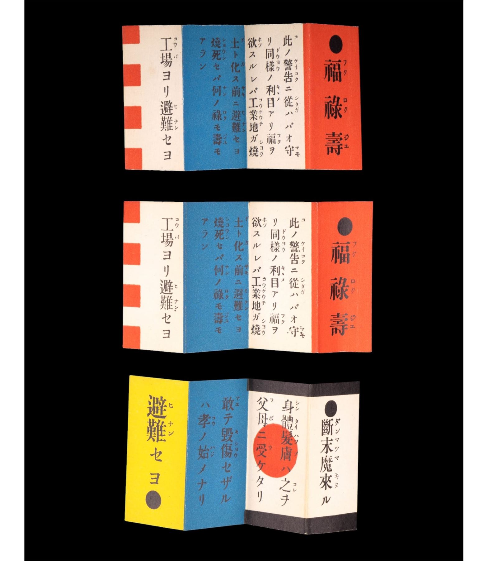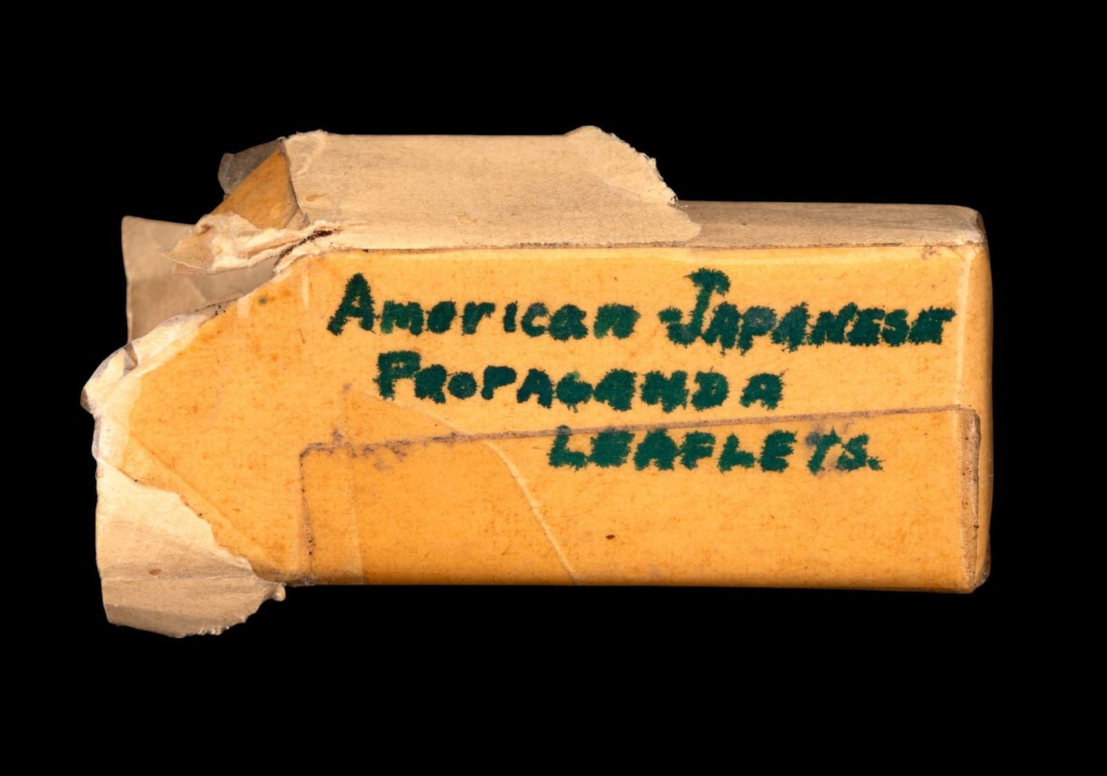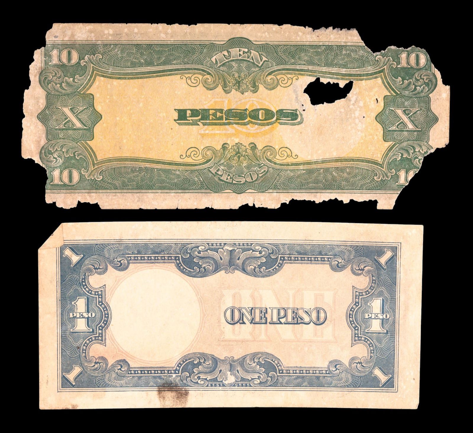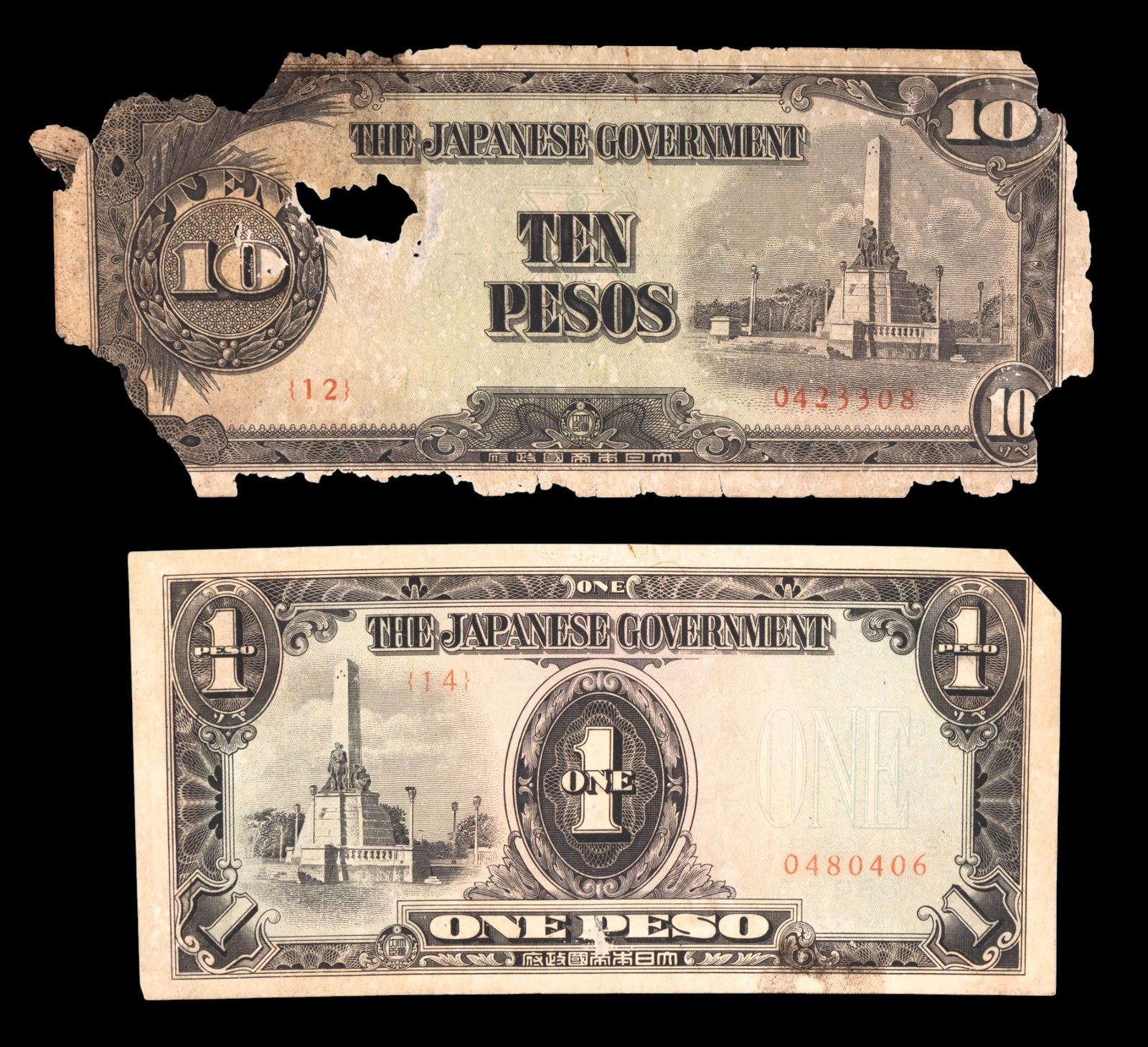 35+ American WWII era Japanese propaganda leaflets with warnings about air raids & other attacks + WWII Occupational Japan one peso & ten peso bank notes made for the Philippines. Ten pesos note has considerable damage.