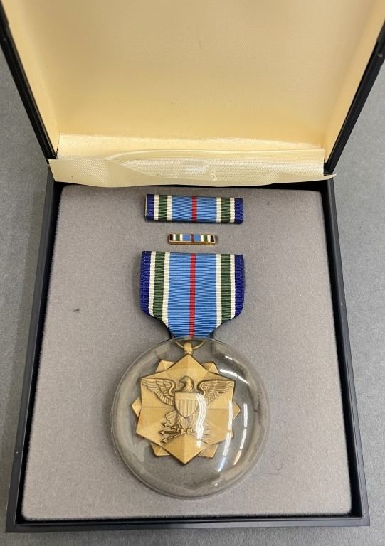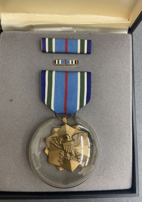 Item/Description: The Joint Service Achievement Medal (JSAM) along with ribbon bar and enameled lapel pin. All in original case. Pin backing to medal imprinted: Lordship / NY - GI.