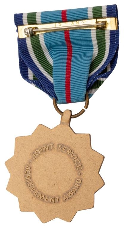 A bronze medal featuring a 12-point star with an American bald eagle. The Joint Service Achievement Medal (JSAM) is a decoration presented by the United States Secretary of Defense to officers below the grade of O-6 and enlisted members below the grade of E-7 who, while serving in a joint military command or activity, have performed either an exceptional achievement or commendable service that has not been recognized by a Commendation Medal.