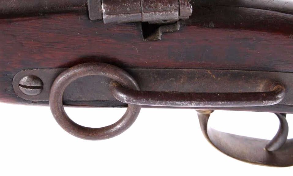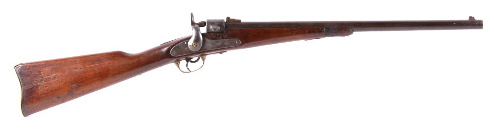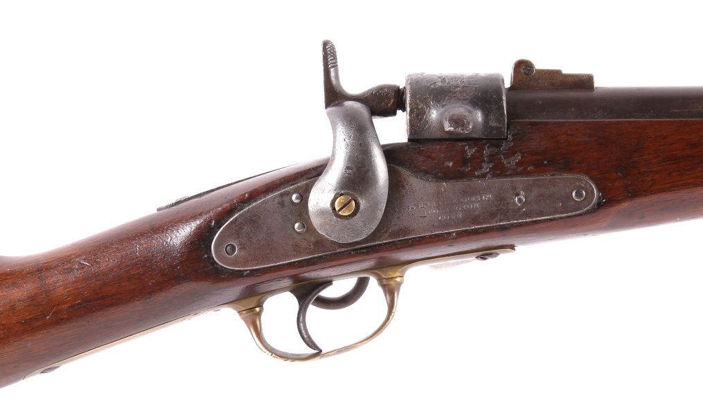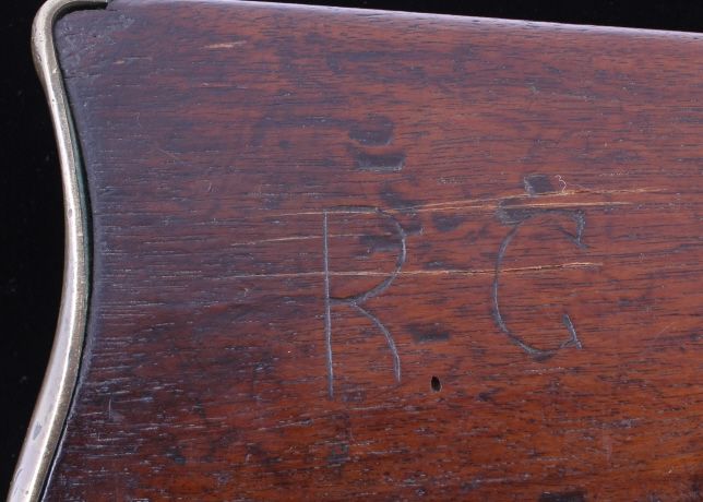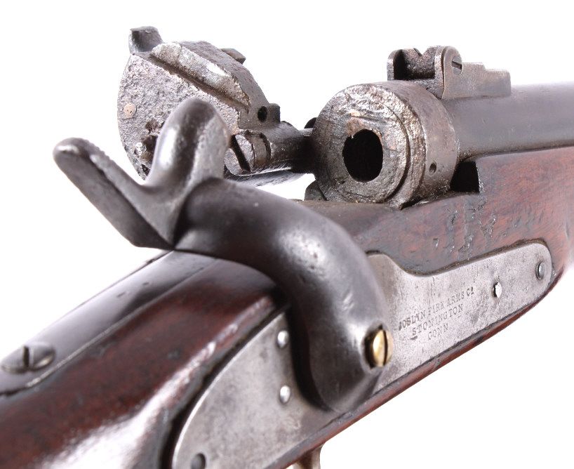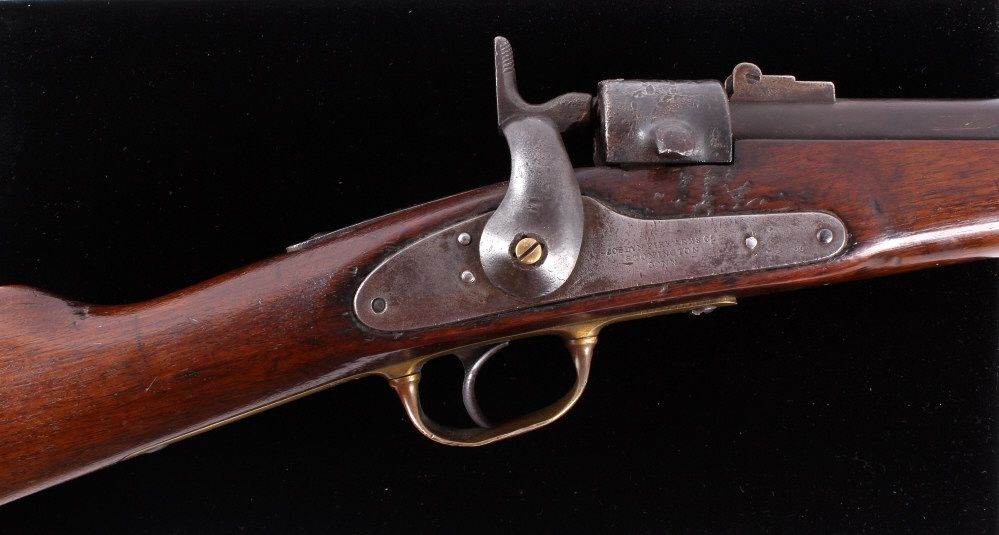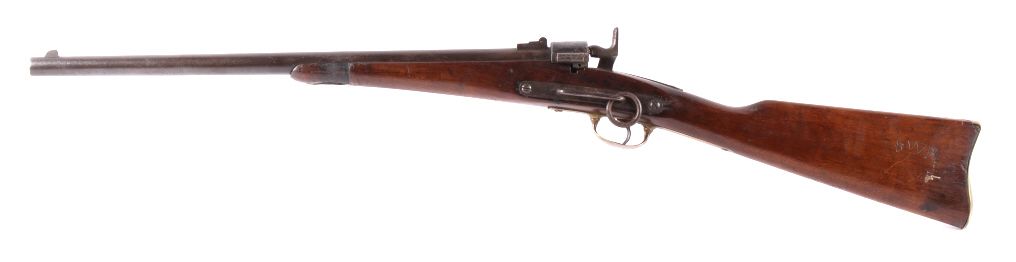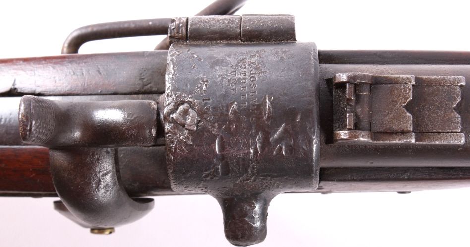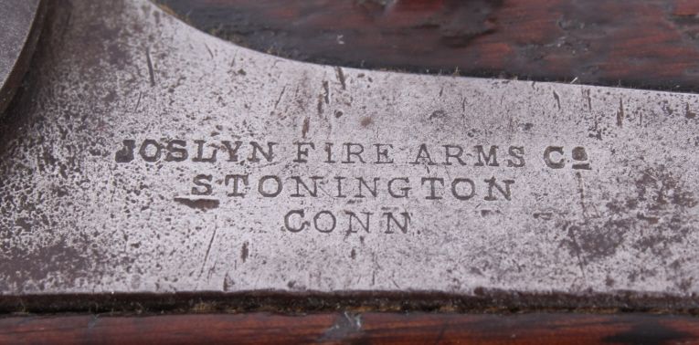 This is a Joslyn Fire Arms Co Stonington Conn. breech loading Saddle Ring Carbine. The piece is a U.S. Model 1862 from the Civil War era. The early firearm has a rifled barrel and percussion action with breech single shot load. The side plate is clearly marked and the top of the breech is also marked Joslyn, but does show wear. The hammer and breech load both work and the carbine has a 20" smooth barrel, with wood stock, and brass trigger guard and butt plate. Side of the stock is carved, "RC" on one side and "BWH" on the other. RARE early Americana firearm. Exact caliber is believed to be .52 (breech opening is 6/16-7/16 opening and barrel end has a 9/16" opening) Has three tip up sights.
