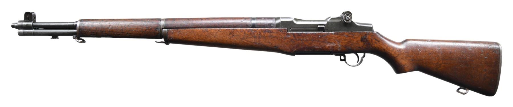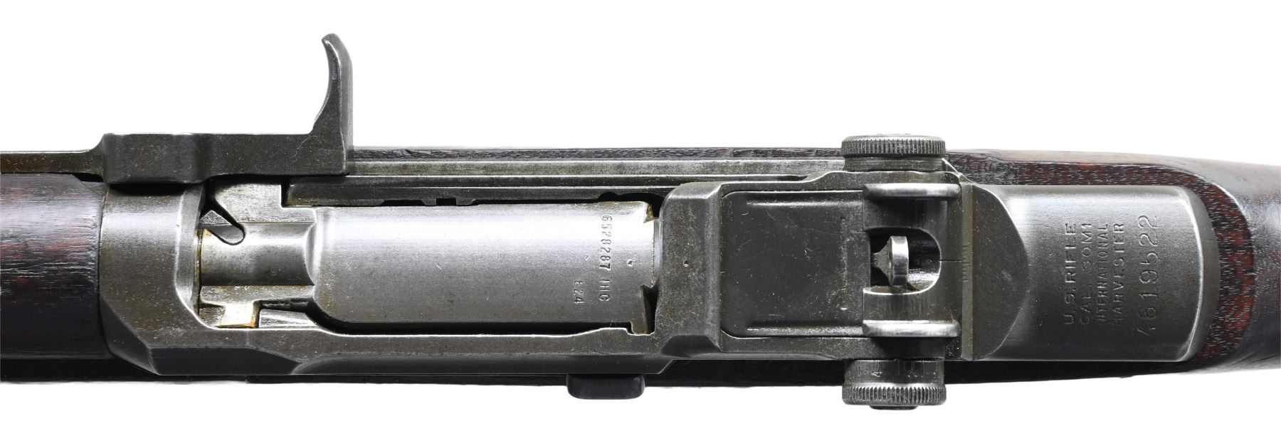 GARAND SEMI-AUTO MILITARY RIFLE. Cal. 30-06. S# 4619522. Bbl. 24". Marked on the right side "LMR 12 54". Throat gauges: 1.0. Muzzle gauges: 2.0. All major parts markings are "IHC" except the LMR barrel which is correct on this rifle. T105E1 rear sight. High hump gas cylinder lock. Stamped trigger guard. Walnut stock set. Buttstock is marked on the left side w/ worn boxed defense acceptance eagle & marked under grip w/ encircled "P" proof. CONDITION: stock set has extensive wear, staining & handling marks on its original finish. Notable small missing chips at front edge of pistol grip & at the rear edge of the forearm at the floorplate. Metal retains 60% of its worn original Parkerized finish. Very good shiny bore. (25-2962/RW). CURIO. $1,000-1,500.