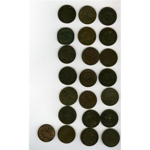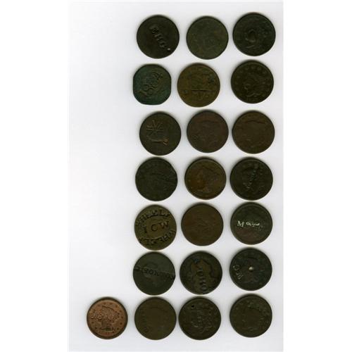 <B>Counterstamped Group Lot of U.S. Large Cents.</B></I> Consists of 21 large cents plus a British halfpenny, with various types of counterstamps. Viewing of this lot is recommended. Current market value is about $150-$250.