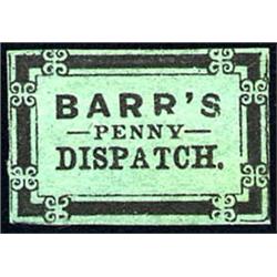 U.S. U.S. Locals and Carriers 1855 Barr's Penny Dispatch Lancaster, PA., black on green, without gum and with tiny thin spot, but of a different type than the above lot. Genuine per the Lyons book. F-VF. Scott No. 8L2 US$150