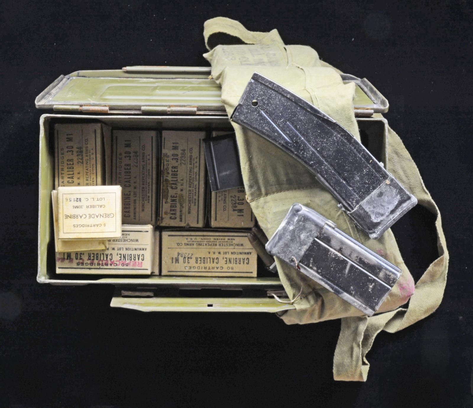 1 Lg. ammo can containing: 14 boxes of 50 rds. / 2 bandoliers of 120 rds. each on stripper clips / 2 boxes of 6 rds. each grenade launching blanks / 1 each of following mags: 5 rd., 15 rd. & 30 rd. M-2. CONDITION: good serviceable ammo & mags. (02-14143-3/NW). $600-800.