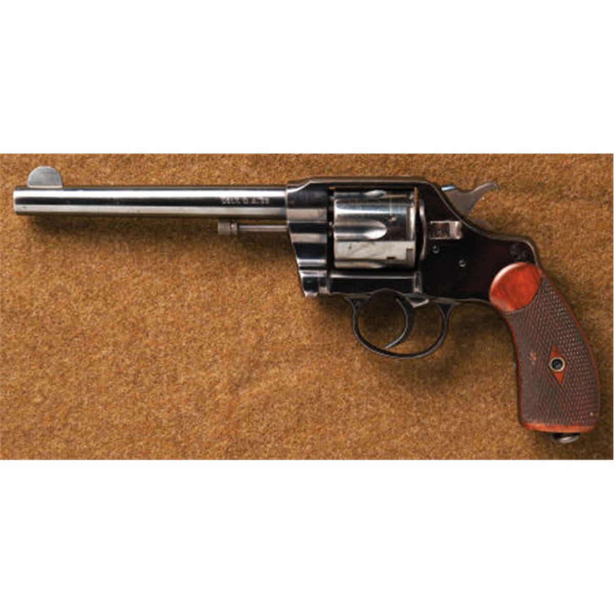 *U.S.M.C. Colt Model 1905 Double Action Martial Revolver. Serial no. 10364, .38 caliber, 6-inch barrel with standard address and marked: Colt D.A. 38 on left side. Rampant Colt on frame. Assembly no. 974 on crane, inside of frame, cylinder latch, cylinder, beneath ejector and written inside grips. Checkered walnut grips. Butt marked: USMC No. 364. Manufactured in 1906. Approximately 800 of this model were purchased by the United States Marine Corps.Condition: Excellent to mint. Retaining approximately 95-98% finish overall. Light tracking line on cylinder and some flaking and portions of backstrap faded.