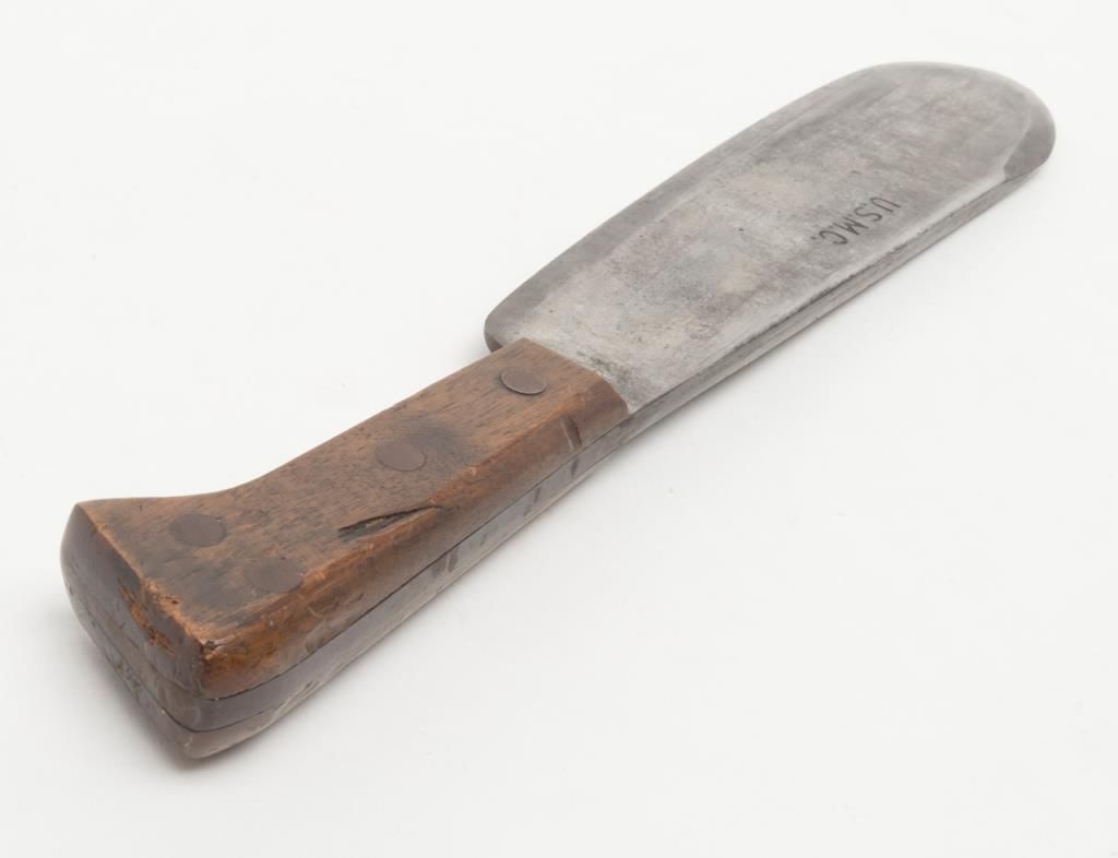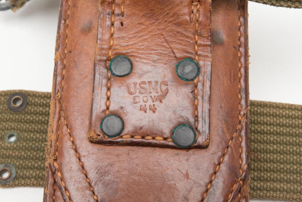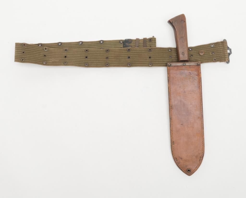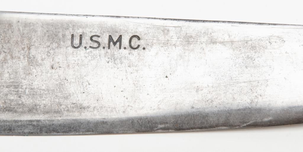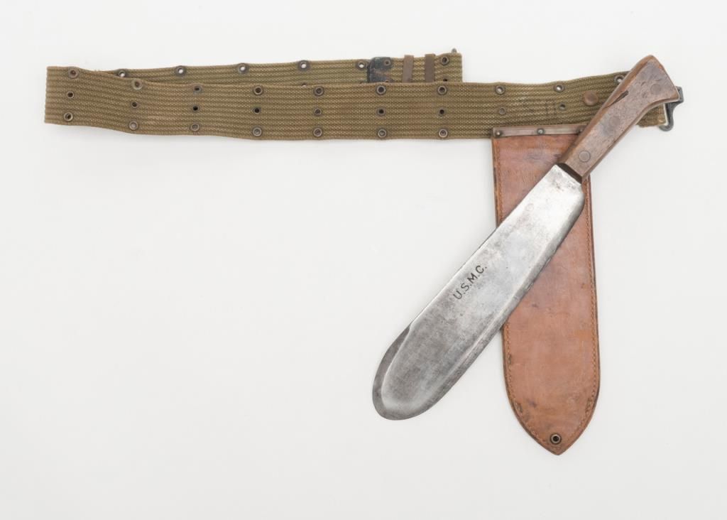 U.S.M.C. marked bolo with scabbard also marked “Boyt” and “U.S.M.C.” dated 1944 and both in good to very good condition with web belt attached. Est.: $150-$300