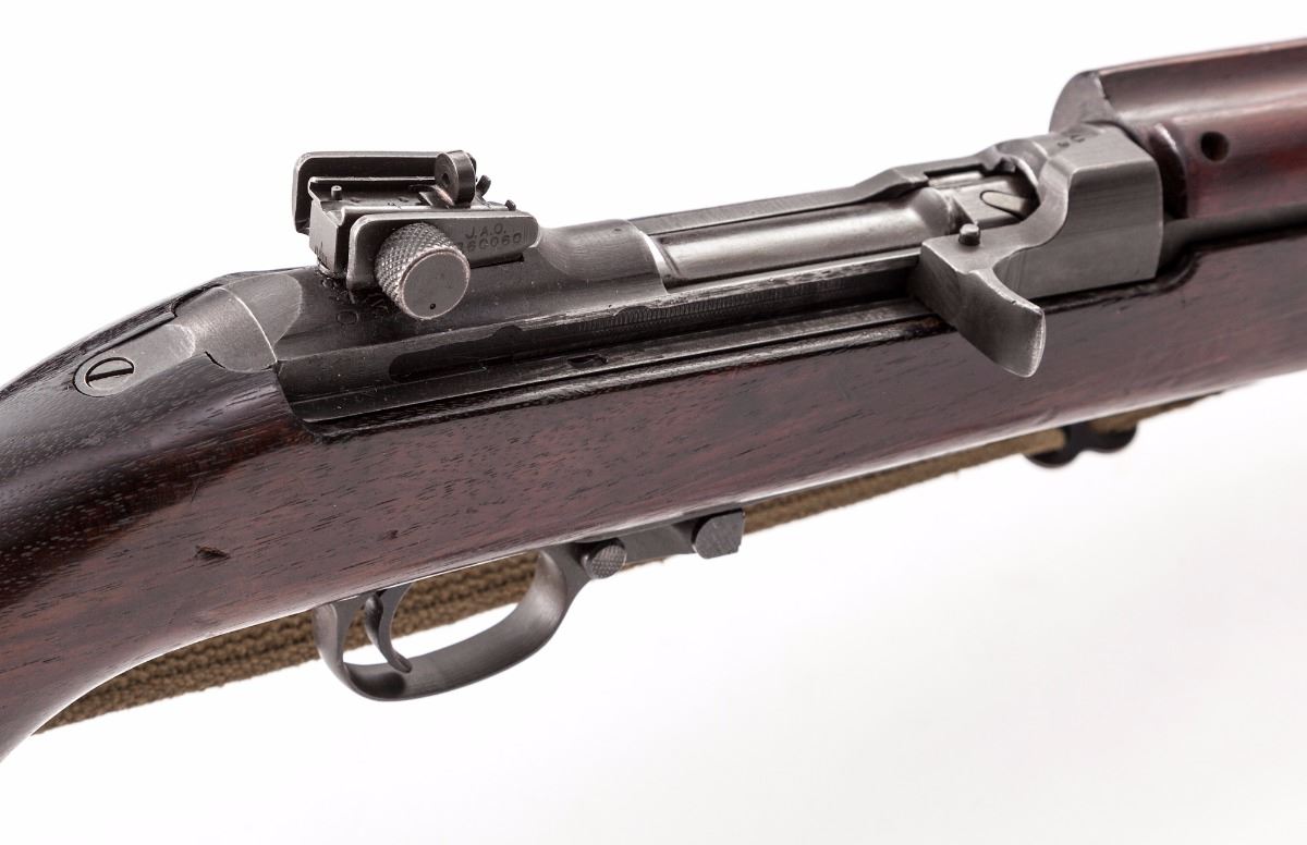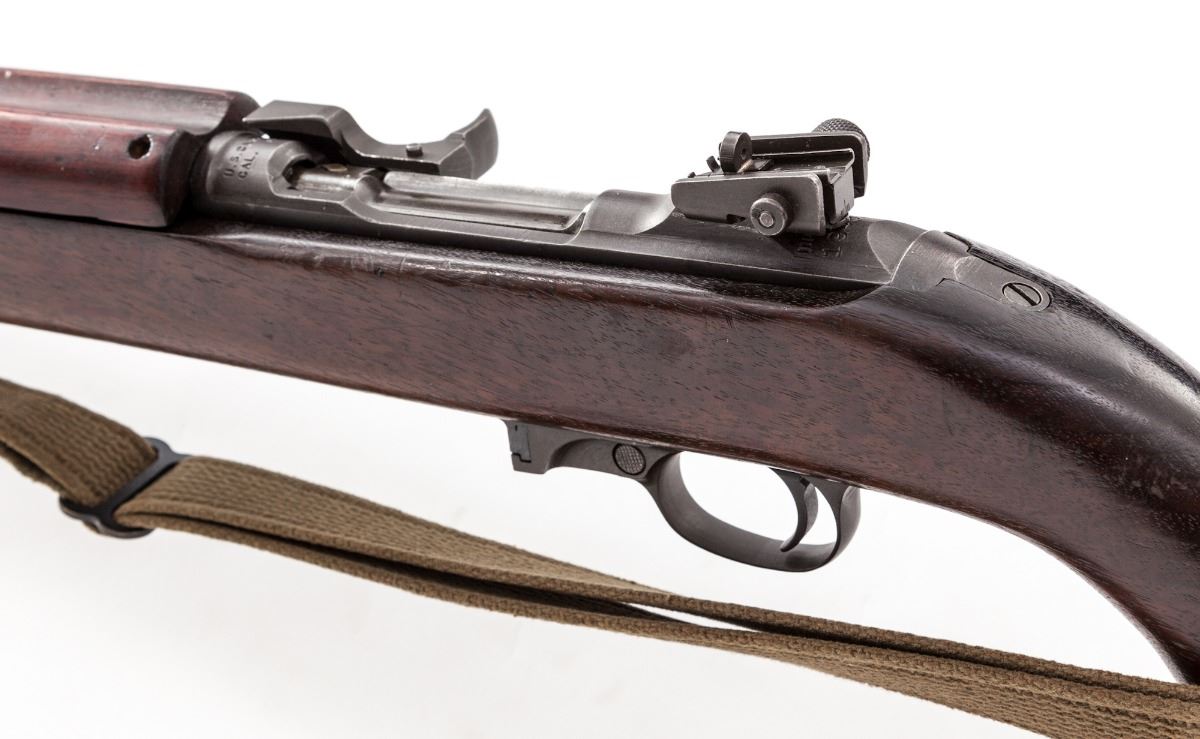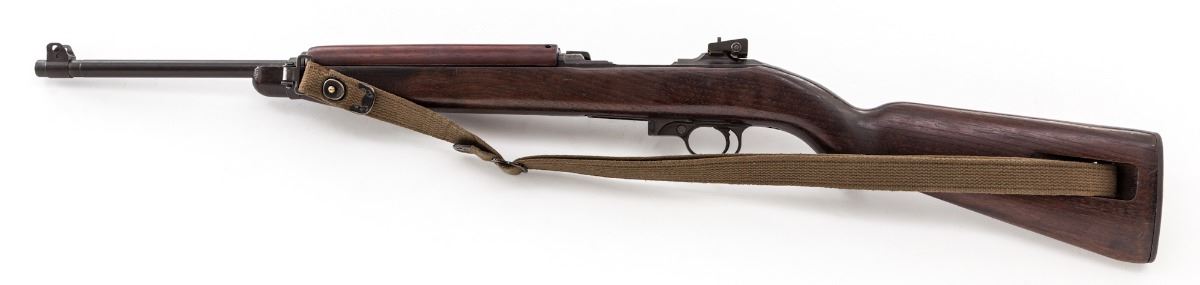 U.S. M1 Carbine, by Inland, #194370, .30 Carb. cal., 18'' barrel, parkerized finish, walnut stock, with ''N'' marked front sight and milled adjustable rear sight. Barrel is marked ''12-42''. Condition is excellent as upgraded retaining approx. 95% parkerized finish. Barrel, receiver and stock are all marked Inland. The ''I'' cut high wood stock is marked ''OI'' in sling cut with large Ordnance wheel on right side and is in excellent condition. Handguard is the early two-rivet wide channel type. Mounted with sling and oiler. Action is tight, bore is bright. Est.: $800-$1,200. (C&R)