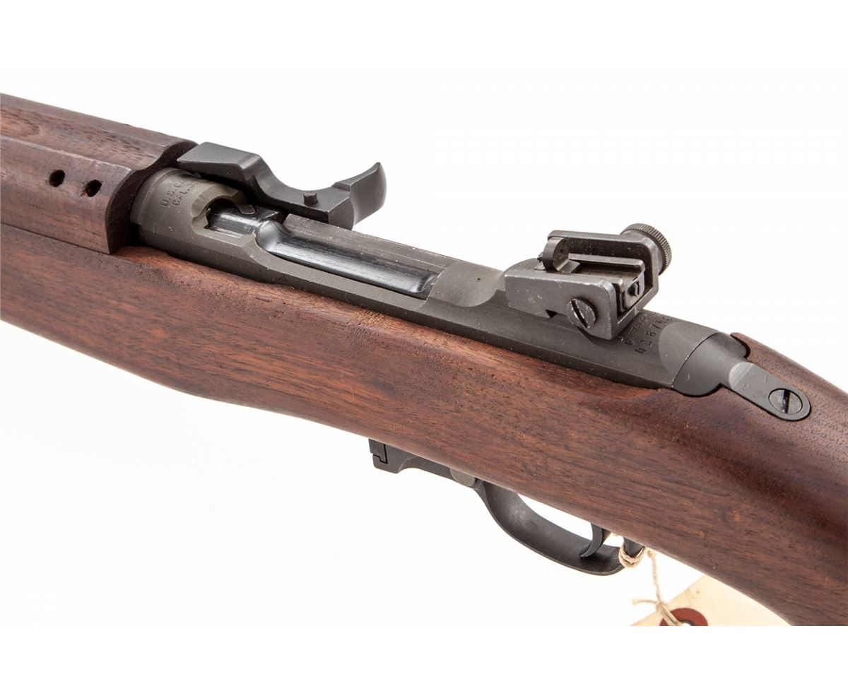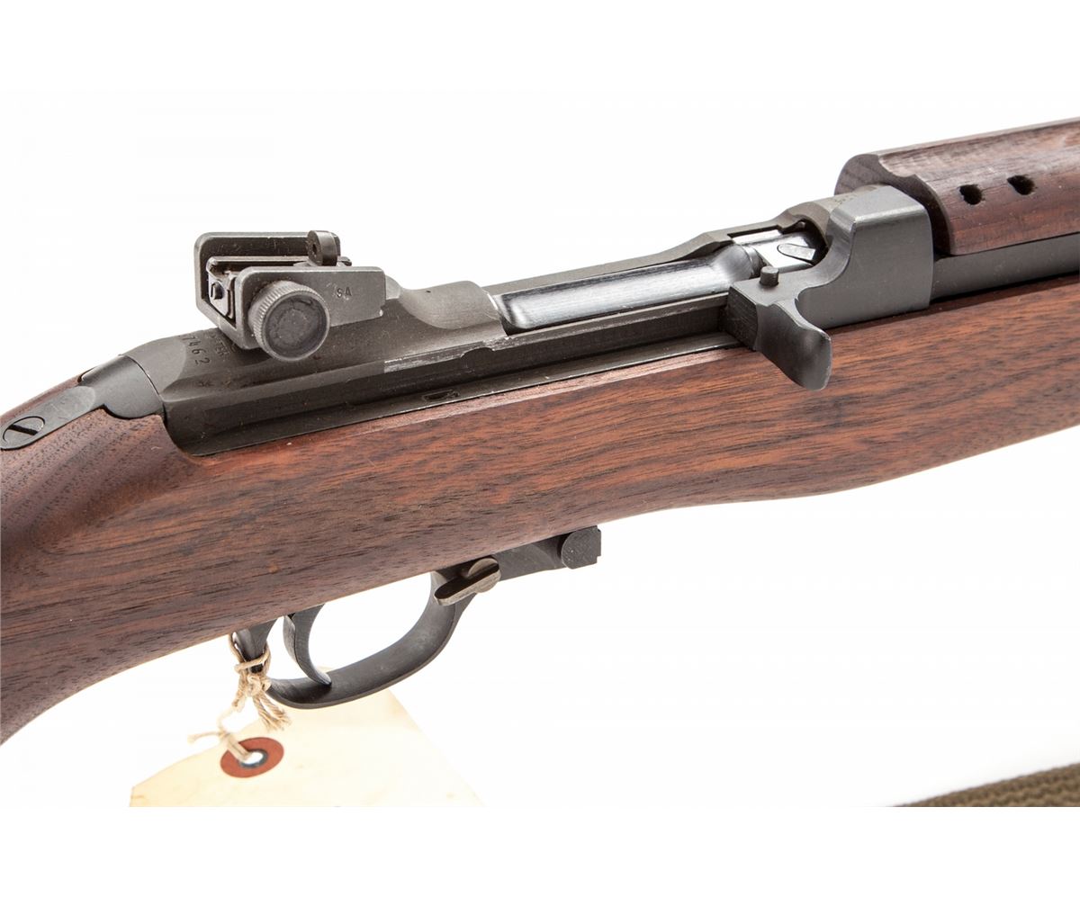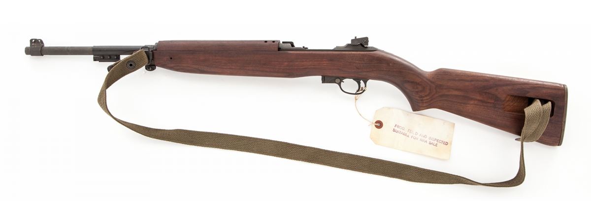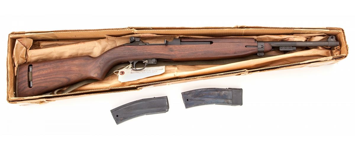 U.S. M1 Carbine, by National Postal Meter, #4187462, .30 U.S. Carb. cal., 18'' Buffalo Arms barrel dated 1-43, flat bolt, Type 2 adjustable sight, flip safety, parkerized finish, beautiful walnut M2 stock with four-rivet upper handguard and two (2) 30-round magazines, in original DCM cardboard box with original hang tang still in place. Sling and oiler are present. Shipped to our consignor via Railway Express, Feb. 4, 1964, from Red River Army Depot, Texarkana, TX. Condition is excellent showing one post-war rebuild upgrade, but prior to that remaining in new condition. Est.: $1,800-$2,400. (C&R) (High-cap mags not available to Calif. residents.)
