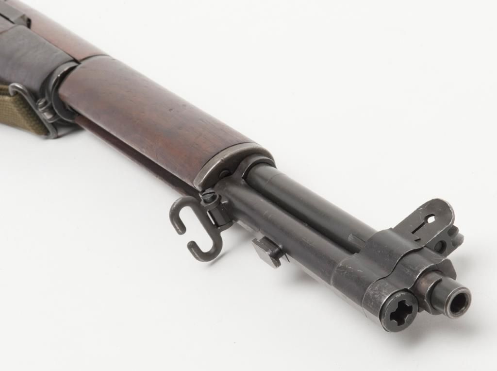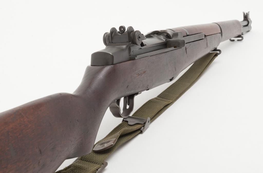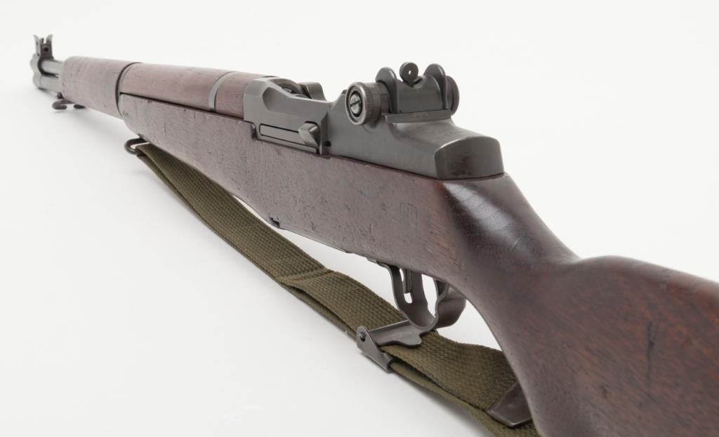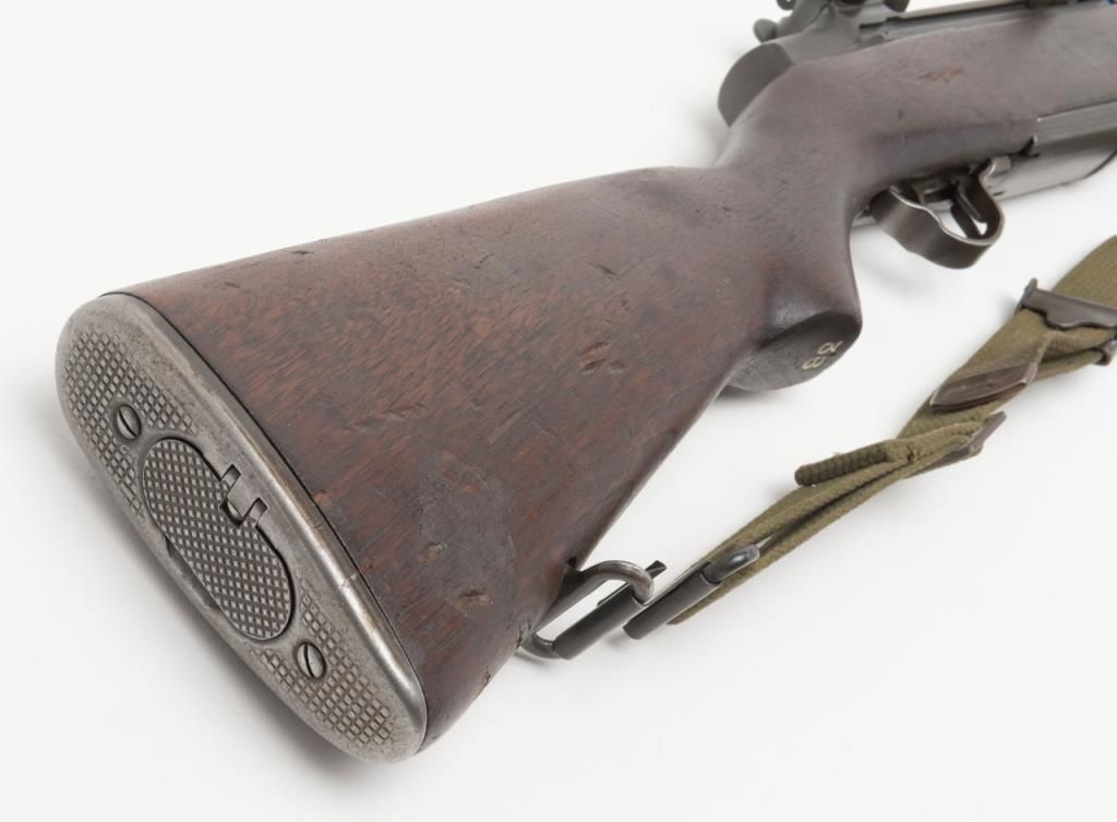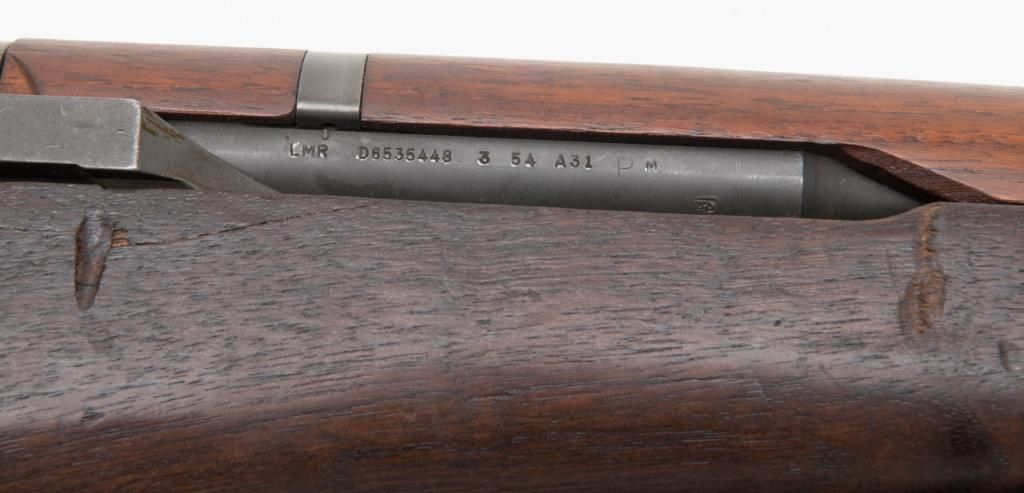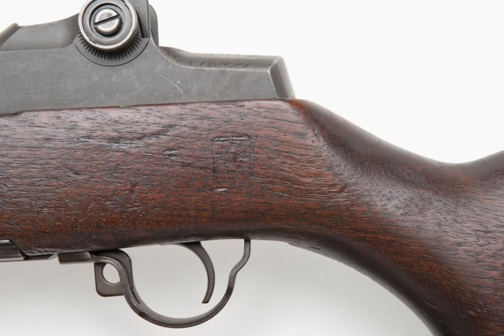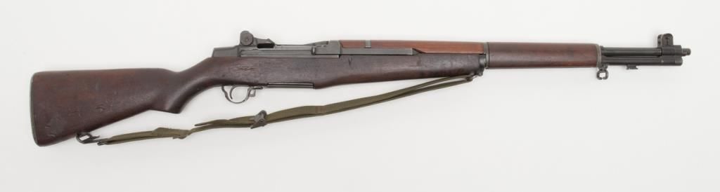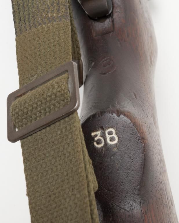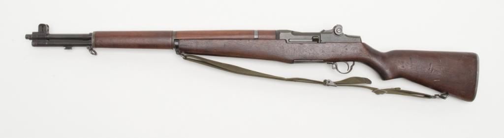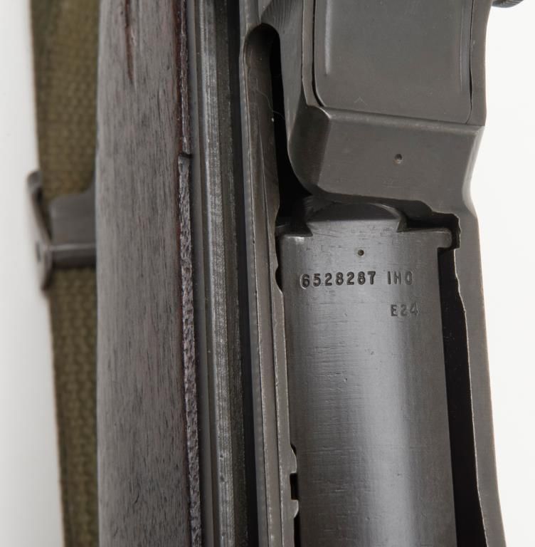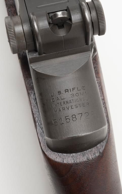 U.S. M1 Garand semi-auto rifle by International Harvester, .30 cal., 24” LMR-marked barrel dated 3-54, military finish, wood stock, green woven sling, #5158728 in overall very good to fine condition showing the majority of its militaryfinish, very good to fine bore, crisp action and markings, very good + wood with circle P proof and “38” stamped on the bottom of the semi-pistol grip; stars over eagle inspector’s cartouche on the left side of the stock above the triggerguard; some scattered mars from storage. (C&R/PPT). Est.: $700-$1,400.