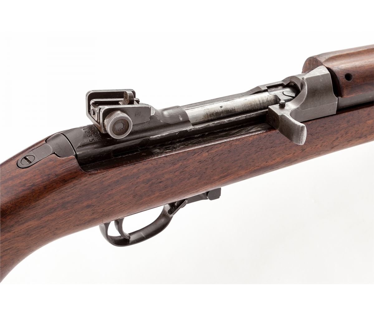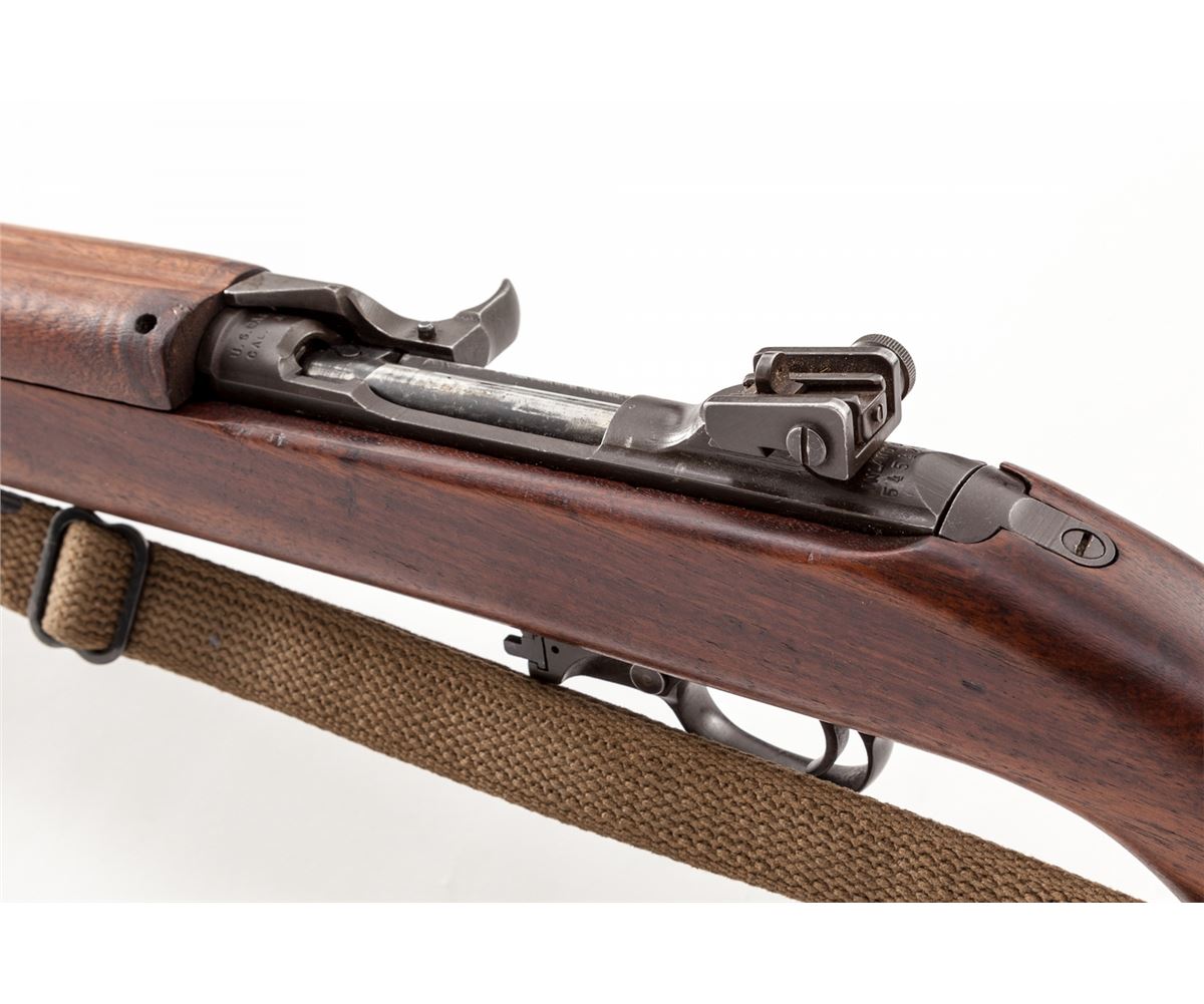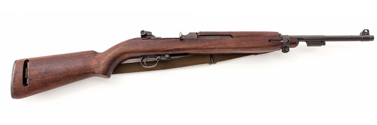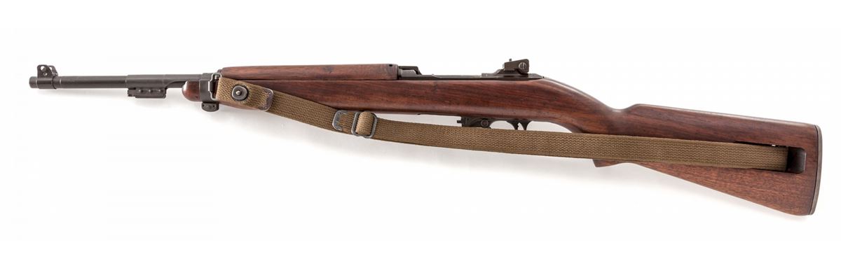 U.S. M1 Semi-Automatic Carbine, by Inland, #5454235, .30 M1 Carb. cal., 18'' barrel dated 8-44, parkerized finish, walnut stock and forend, round bolt, flip safety, Type 2 sight, and bayonet lug, with post-war green canvas sling. Condition is very good as overhauled with some mixed parts. Small amount of red paint to front sight blade. Good action, bright bore. Est.: $1,000-$1,500. (C&R)