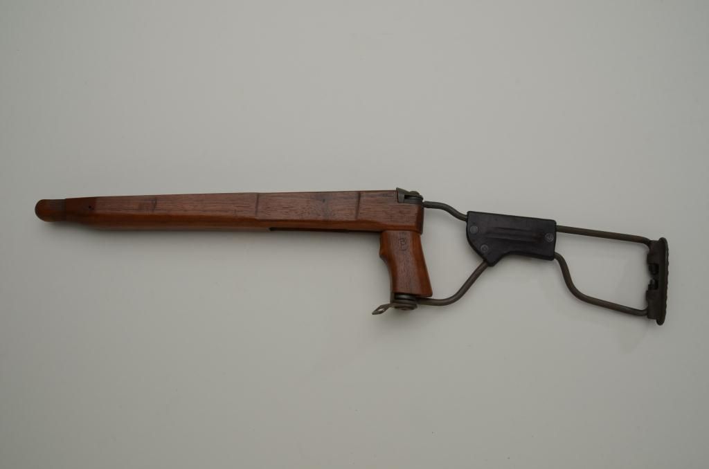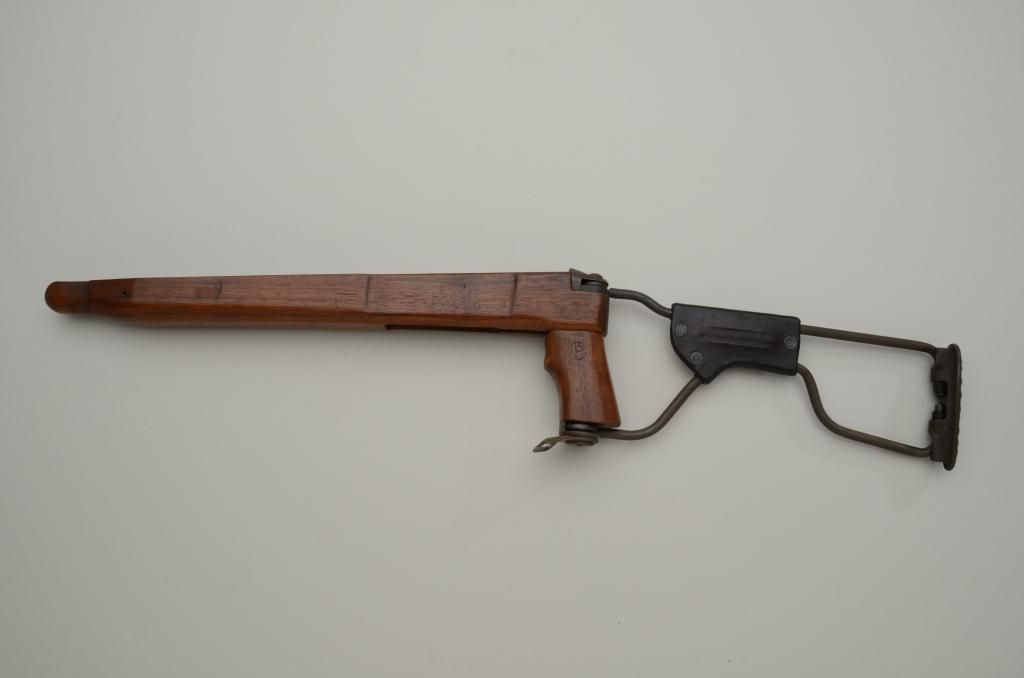 U.S. M1 carbine paratrooper stock ONLY; overall very good condition with some scattered old mars from storage; left side of stock at rear shows circle P proof on pistol grip and inspector cartouche above on stockin square, two partial initials over an E and D or B; metal collapsible skeleton stock is also very good with leather center piece and oiler. Est.: $150-$300.