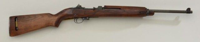 U.S. M1 carbine, receiver marked Irwin-Pedersen, .30 cal., 18” barrel marked Underwood with flaming bomb proof and dated 11-43, military finish, tan woven sling, metal oiler, flat bolt, flip-up two stagerear sight, no magazine, wood stock, #1769390; accompanied by a U.S. marked soft case. This gun is in overall good to very good condition showing considerable military parkerized finish on metal surfaces, verygood bore, good action although slightly tight on closing, good markings, very good wood stock with IP in square cartouche and crossed cannons on right side of butt stock and IR-IP with flaming bomb markings on flatof sling channel. Irwin-Pedersen M1s are one of the rarest variations to find in any condition and are highly sought after by collectors. Est.: $2,000-$4,000.