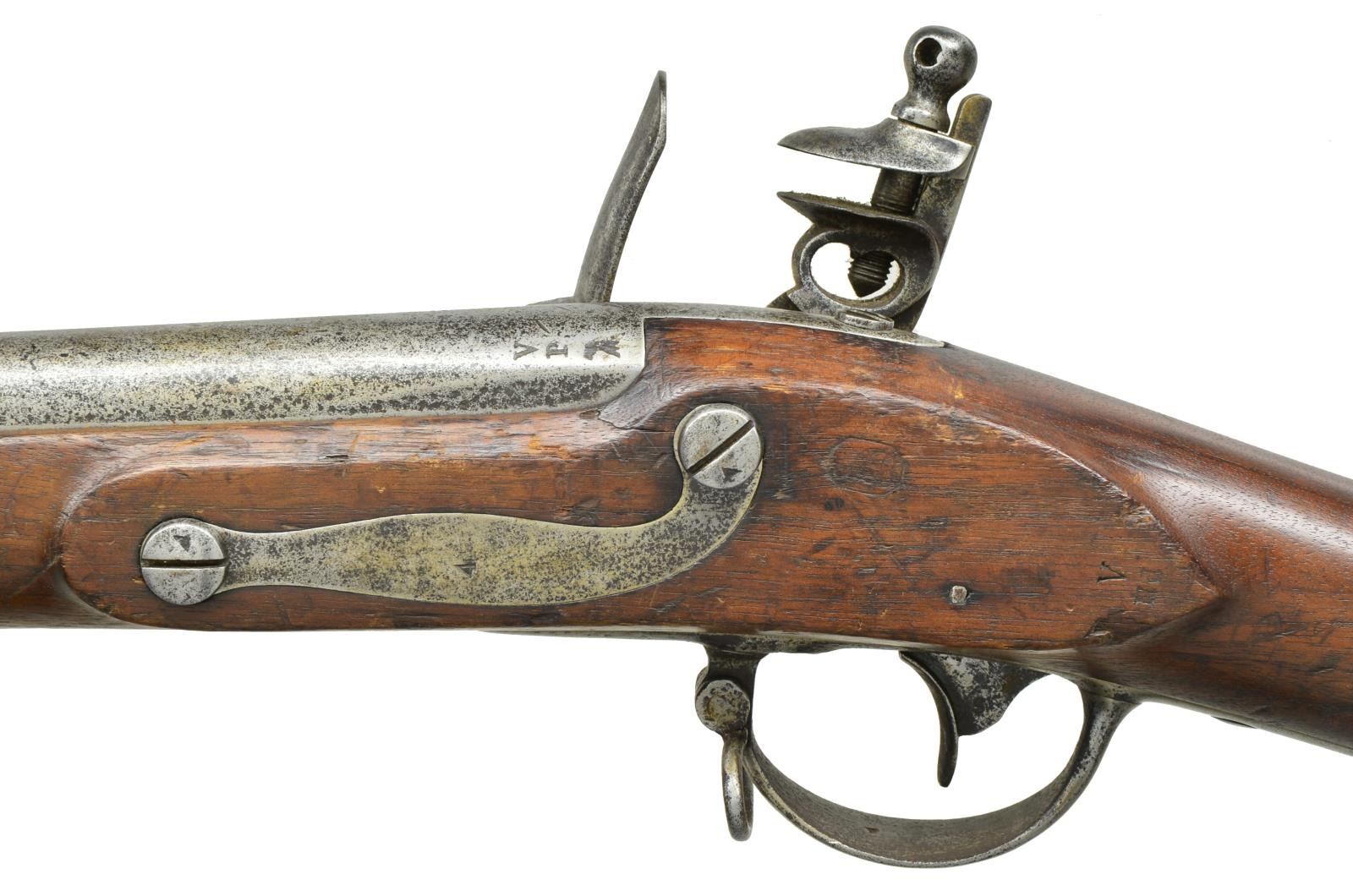 on the left side. Lock shows a drooped winged American eagle looking left with "US" underneath in front of the cock and "HARPERS FERRY 1824" to the rear of the cock. Iron trigger guard, buttplate, side plate, barrel bands, nosecap, ramrod and sling swivels. The detachable pan is brass. Stock has clear inspector's marks to the rear of the side plate. Solid wood with what may be lightly scratched in initials on the left side. This is an exceptionally scarce Harpers Ferry musket. 1,039 Of these were produced at Springfield but the number produced at Harpers Ferry is unknown and suspected to be far less than the Springfield production numbers. Because of its size, the artillery musket has often been referred to as a cadet musket being 5 5/8" shorter than the M1816 musket it was modeled after. CONDITION: barrel has a medium gray finish with scattered areas of darker oxidation. Proofs are quite clear. The lock plate and the remaining iron parts also have a medium gray finish with very slight pitting noticeable. Lock holds both full and half cock. Wood shows light to moderate scuffs and scrapes with a few splinters around the ramrod channel. A good bore that would benefit from a professional cleaning. (01-20955/BF). $4,000-6,500.