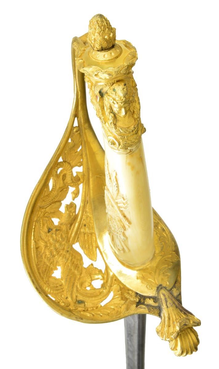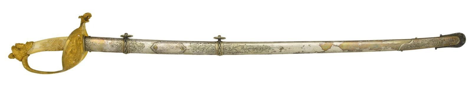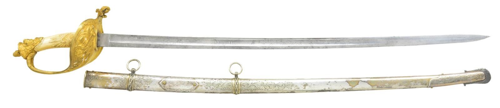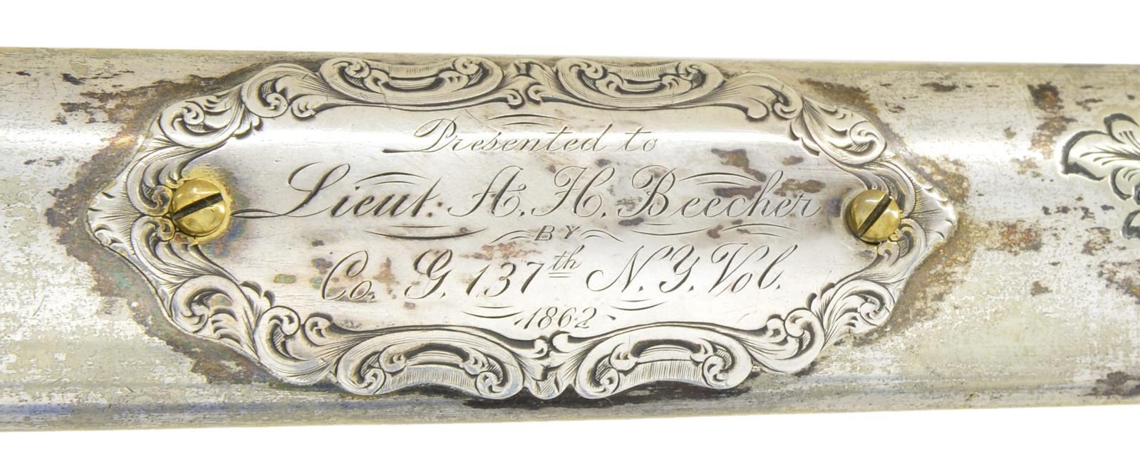 U.S. M1850 VERY HIGH GRADE STAFF & FIELD OFFICER'S SWORD PRESENTED TO LIEUTENANT AUGUSTUS H. BEECHER OF THE 137TH NEW YORK VOLUNTEERS WHO WAS SEVERELY WOUNDED AT GETTYSBURG. Overall length: 39 1/2". Blade length: 32". Blade has a single wide fuller with a single narrow 13 1/2" fuller below the spine. The blade is etched over half its length with numerous patriotic and foliate motifs including the bust of an eagle at the terminus of the etching on both sides. Other etchings include a spray of arms with a ribbon that reads, "DEEDS, NOT WORDS", American flags and shields, mortars and mortar balls, an eagle surrounded by 21 stars, a large "U.S" and a spray of classical arms topped by a Roman standard. There is also a 6 1/2" panel on one side with the words, "One Flag . One Country". The ricasso is stamped, "W. CLAUGBERG (knight) SOLINGEN". Heavily gilded brass hilt with an exquisite half basket guard featuring a 2 sided depiction of an eagle attacking a snake flanked by the letters, " U S " on a field of acanthus leaves. The inside of the guard opposite the eagle and snake is engraved with a foliate motif. Exceptionally fancy quillon with leaves encompassing a sphere. Knuckle bow is adorned with more acanthus leaves where it joins the highly embellished pommel. The front of the pommel depicts a nearly fully formed head of a goddess wearing a Phrygian cap with laurel and a star. The pommel nut appears to be a fully formed pineapple with an acanthus leaf base. The certifiably antique ivory grip has a leaf motif around the upper and lower borders with the center face being fully carved with a large spray of American arms, flags, a large shield and an eagle in flight. The heavily silver plated scabbard is embellished with foliate decoration throughout. An added panel between the scabbard rings reads, "Presented to Lieut. A. H. Beecher by Co. G. 137th N.Y. Vol. 1862". Iron drag with the remains of silver plating. Lt. Augustus Beecher had an excellent service record throughout the war and was wounded 3 times. He joined the 137th New York Volunteers as a 1st Lieutenant at the age of 23. He fought in numerous battles throughout the war and was severely wounded in the left side of his face on July 3rd. It was noted that casualties for the 137th at Gettysburg were higher than any other regiment in the Corps. In December of 1863, Beecher was promoted to Captain and served honorably until the end of the war. After recovering from his wounds at Gettysburg, he participated in many battles around Atlanta and was with Sherman during his March to the Sea. This presentation saber must stand as one of the most visually appealing in form and embellishment of all sabers of this type. The remarkable bravery and resilience of this Gettysburg wounded officer is the stuff of legend. UNATTACHED ACCESSORIES: a large, 3 ringed binder full of information about the sword, Lt. Beecher and the 137th New York Volunteer Infantry. CONDITION: blade has a pleasing medium gray patina with minor staining throughout. Etching is clear and robust. The hilt retains nearly all of its original gilded finish and is quite striking in its artistic design. The grip has a few expected age cracks but no losses and the carved details remain sharp and vivid. The heavily silvered scabbard retains virtually all of its original plating. The engraved plaque remains quite legible. (02-16741/BF). $25,000-30,000.