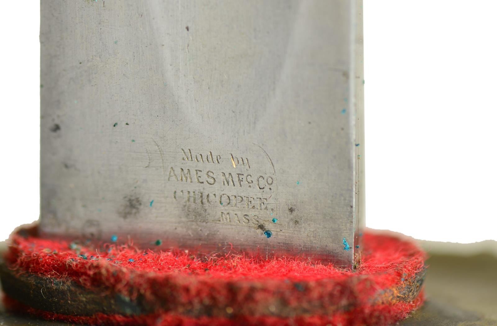 Overall length: 32 3/4". Blade length: 26". Plain blade with a single wide fuller. Ricasso is stamped, "(anchor) P U.S.N. D.R1862" on 1 side and "MADE BY AMES MFG. CO. CHICOPEE. MASS.". Blade has a thick, red felt washer. Solid brass cup hilt with simulated rivets at the knuckle bow area. Top of the guard is stamped, "24M" over "386". Leather wrapped grip. Complete leather scabbard with all copper rivets and an M1860 frog. CONDITION: blade has a light gray overall finish. Hilt has a rich, mellow patina. Grip is complete but may have been tarred while aboard ship. Scabbard is very solid and shows light wear. Frog is complete and shows moderate wear. (02-17664/BF). $800-1,100.