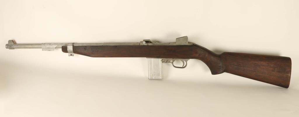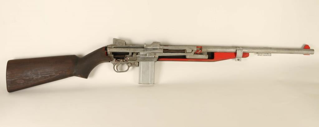 WWII era double size aluminum M2 Carbine cutaway training tool. Has a functioning action with selector switch, detachable magazine, and wood stock. Measures 71" long. Condition is Very Good.