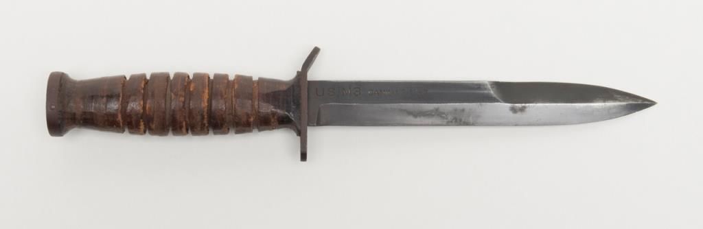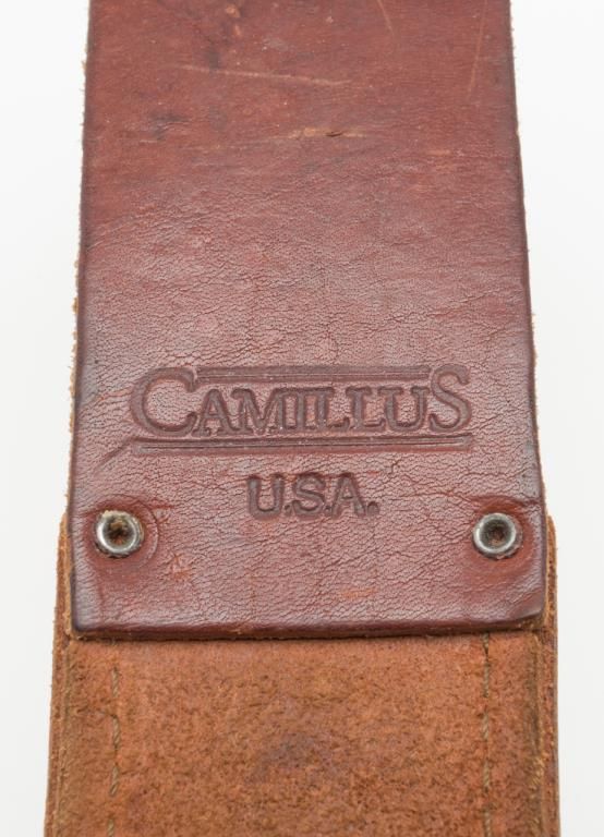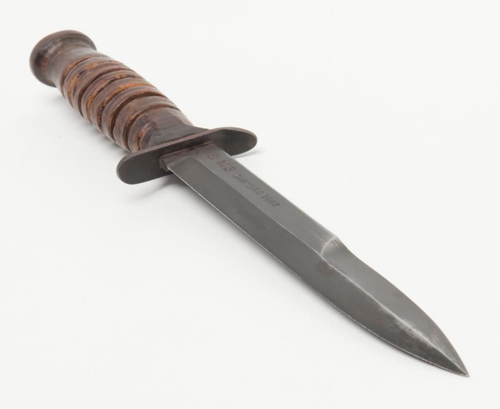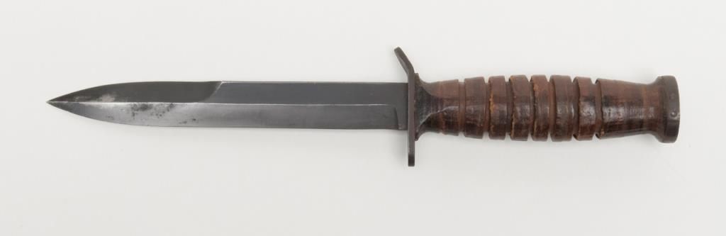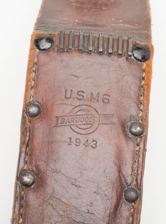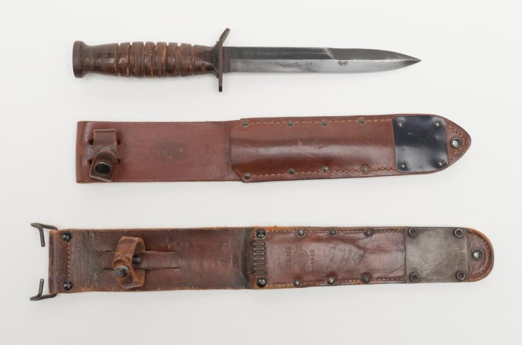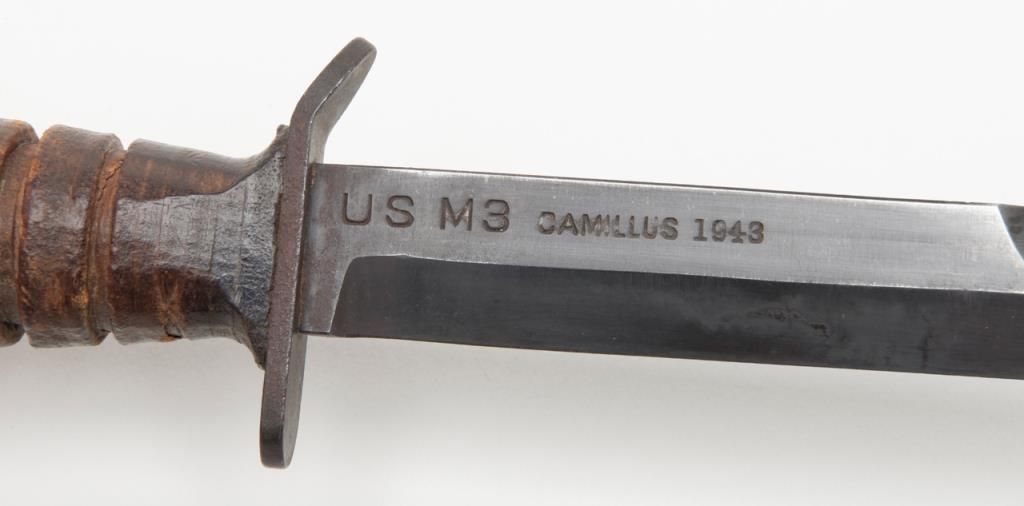 U.S. M3 fighting knife by Camillus dated 1943 with leather scabbard, also by Camillus in very good to near fine condition plus an extra U.S. M6 leather scabbard by Barwood, dated 1943 in overall good condition. Est.: $350-$700.