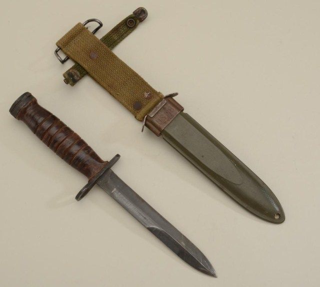U.S. M4 bayonet by Utica numbered 915797 with stacked leather grip in USM8 sheath by BM Co. with light green woven and metal hanger in overall good condition. Est.: $50-$75.
