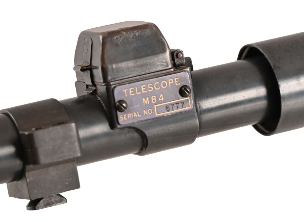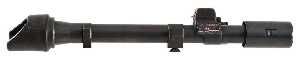 Scope used for M1 Garand sniper rifles. 2.5X magnification. Very good condition with rubber eye piece. Two small flecks in view. Has rings installed. SN 8777.