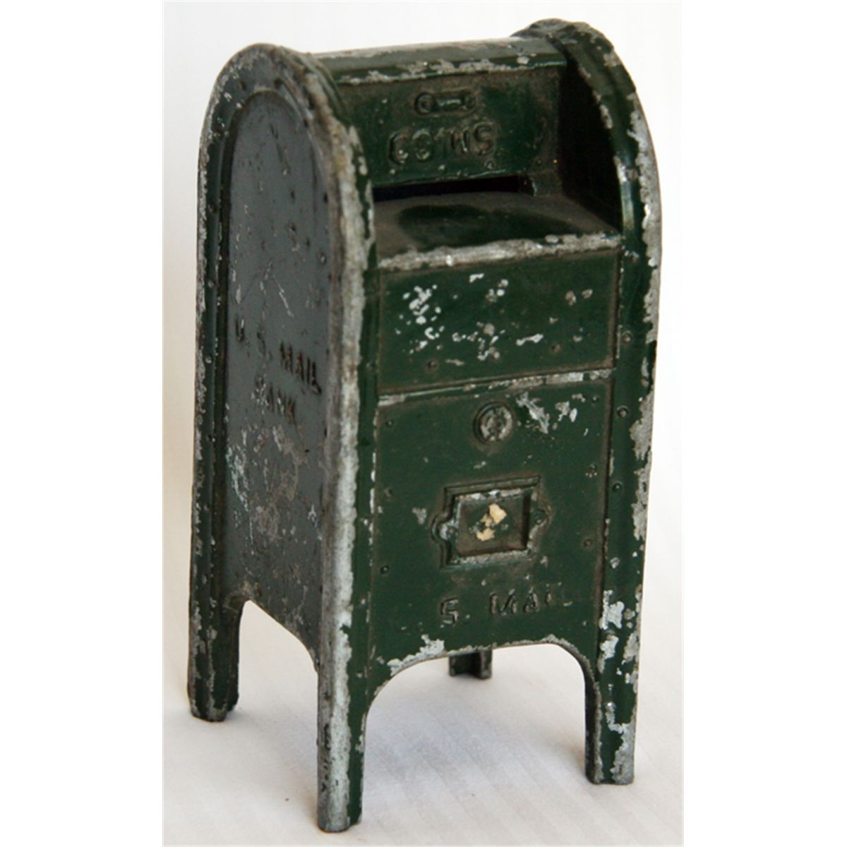 U.S. MAIL. BANK. Standing Mail Box shaped. Coin opening on top. No handle, key or serial number. Pat. Pending on bottom. 6cm x 14cm x 6cm. Cast iron, with a green finish. Maker unknown. VG.