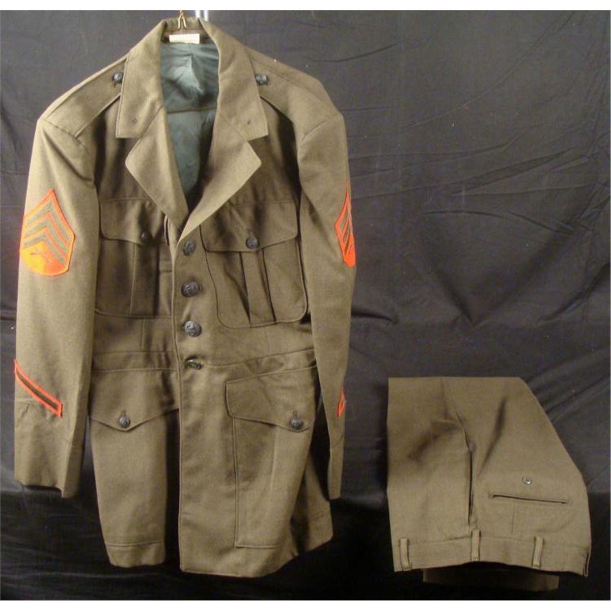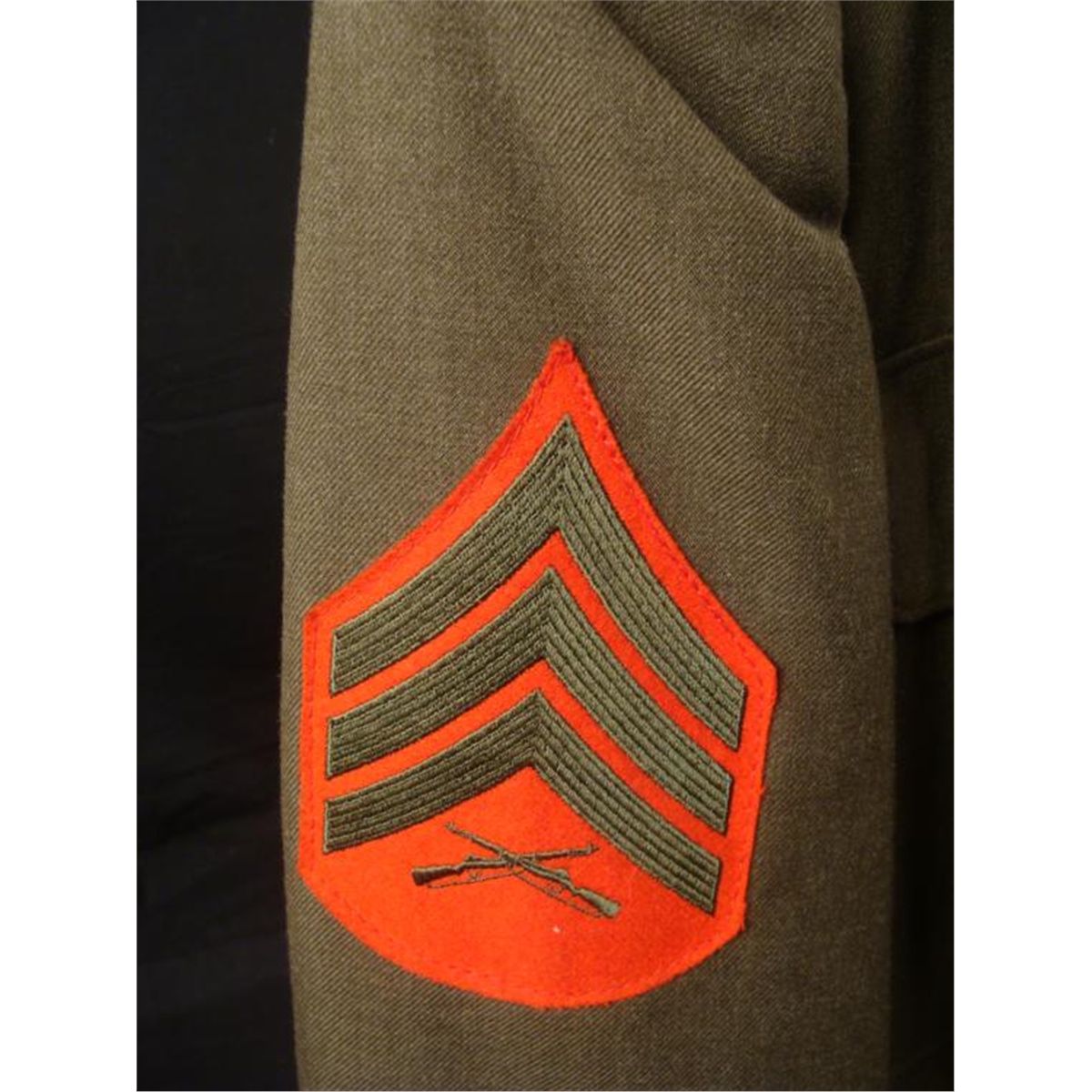 OFFERED HERE IS A U.S. MARINE UNIFORM TUNIC, 4TH GRADE NCO STRIPES AND 1 ENLISTMENT STRIPE. * THE SIZE IS A 42 SHORT, IT'S MADE OUT WOOL WITH NO COLLAR INSIG OR BELT, BUT IT COMES WITH PANTS. *