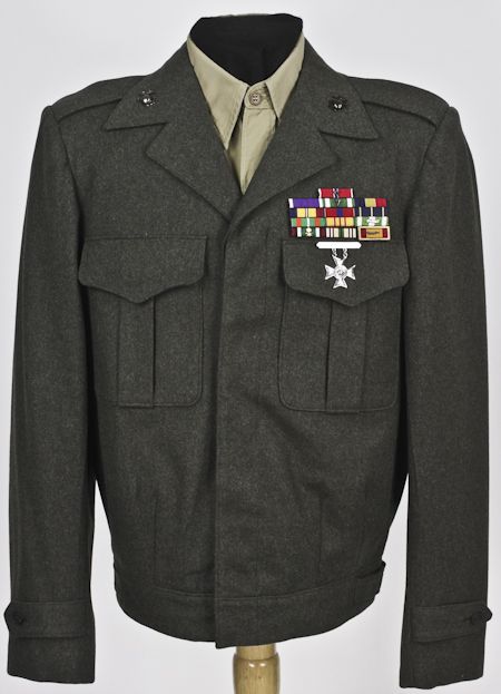 Marines wool jacket with Marines collar insignia, sharpshooter pin, and ribbons including Bronze Star with Valor, Marine Corps Medal, Marine Corps Commendation with Valor, Purple Heart, Vietnam Gallantry Cross, and Kuwait Liberation. With khaki shirt with "Semper Fi" patch.