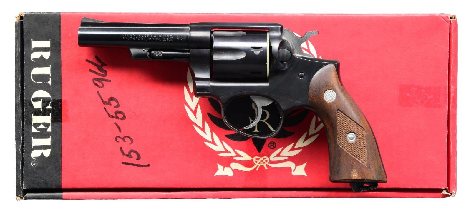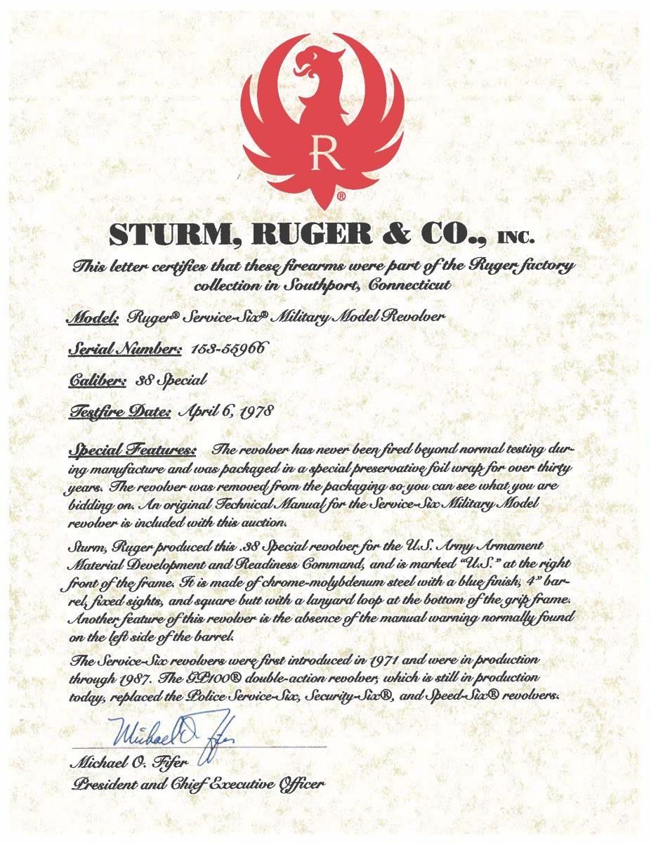 Cal. 38 Spl. S# 153-55966. Bbl. 4" ribbed with serrated blade and no "warning marks"; frame notched rear sight. Mfg. 1977 as Model SDA84L with L designating its lanyard loop; "153-" is at front half of the unusual square butt and "55966" is at the rear half. Right front of cylinder frame stamped "U.S." before being blued; standard checkered walnut service grips with all silver eagle medallions. August 1978 issue of American Rifleman magazine stated that 6,500 with lanyard loops were procured for Army Armament Material Development and Readiness Command. Sold via Ruger benefit auction in October of 2012. Ruger website states shipped 1978 as Model 01517 and that caliber is 38 Special +P; also lists it as a "SINGLE-SIX". UNATTACHED ACCESSORIES: original red and black 1 piece box with serial number on end and top by black marker (NOT Sharpie style). Shipping sleeve (water stain on 1 corner) with ink pen and black marker serial numbers over each other on 1 end plus Ruger auction label that has "POLICE SERVICE SIX" and "LEGAL LIBRARY" on other end. Includes US Military foil that was around revolver within company box, plus foil that contained the red / black box within the shipper; added label to foil with marker applied serial number. Outer UPS box has date and CO address of receiving FFL holder. Manual dated 1/86 plus stamped in red ink as "out of production". CONDITION: all aspects are near excellent appearing new and unfired. (23-6669/NW). MODERN. $500-750.